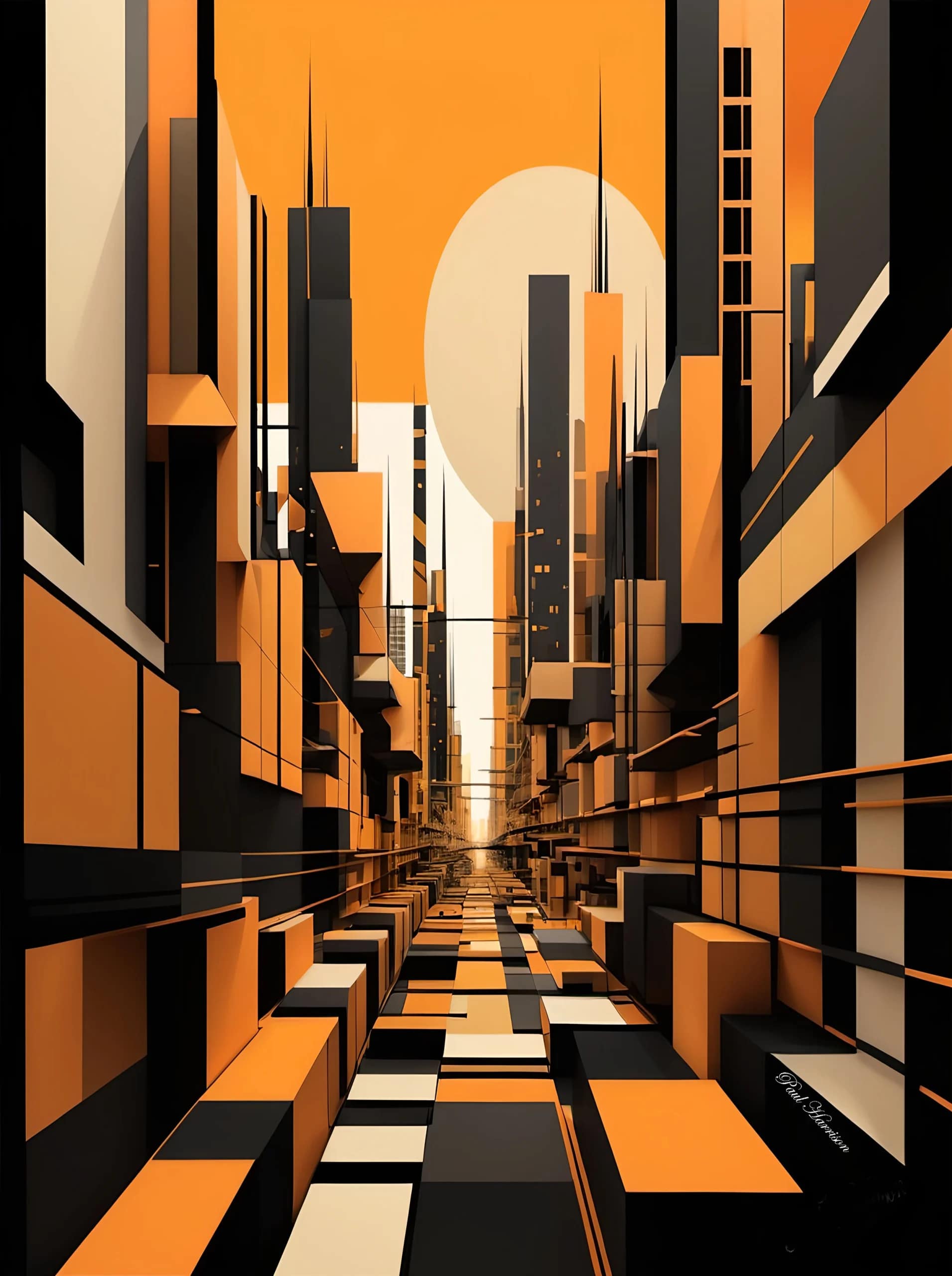 A digital art piece in a geometric, abstract style, featuring a futuristic cityscape.