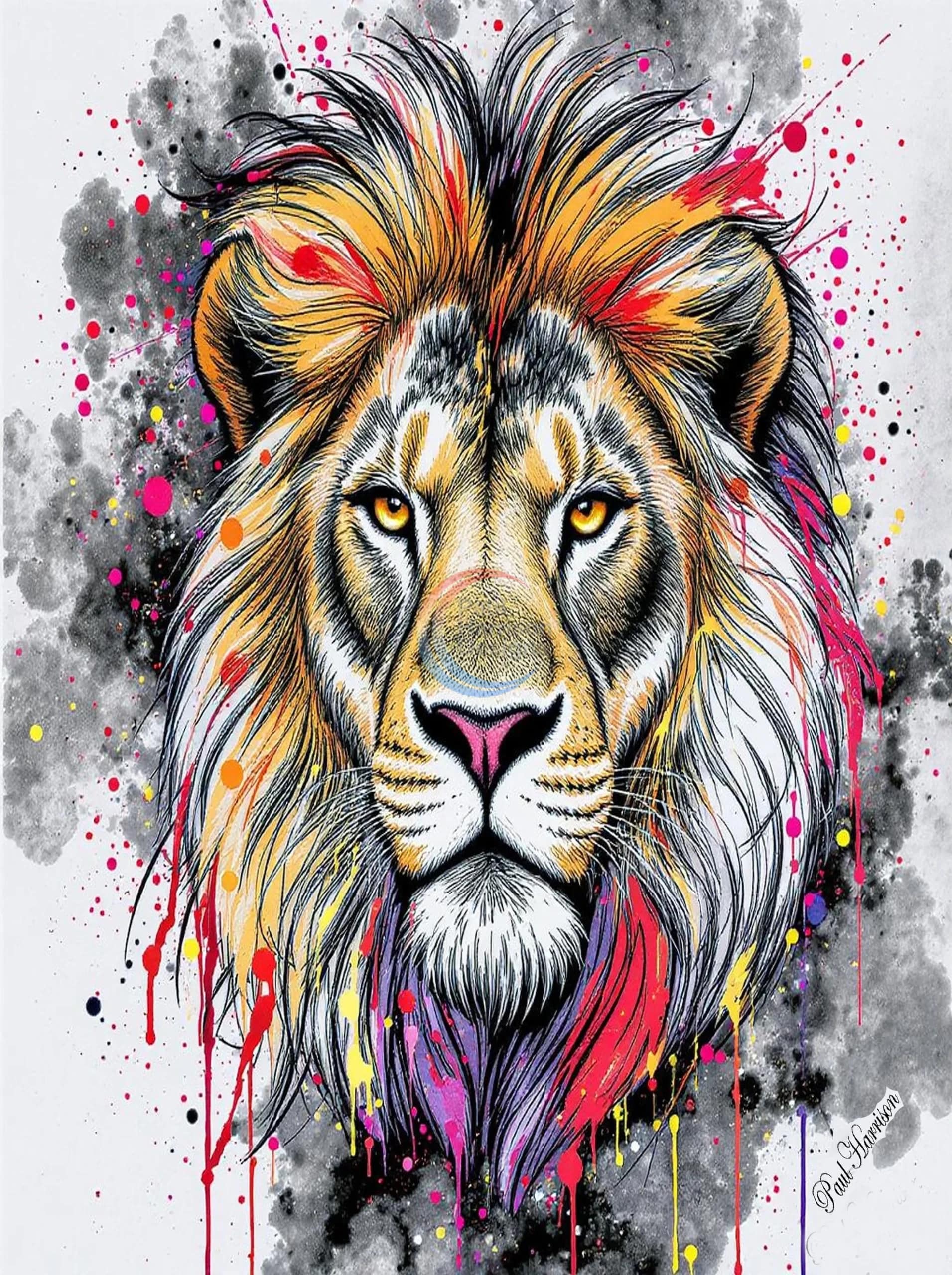 This is a digital drawing of a lions face, rendered in a highly detailed, realistic style with a vibrant, abstract twist.