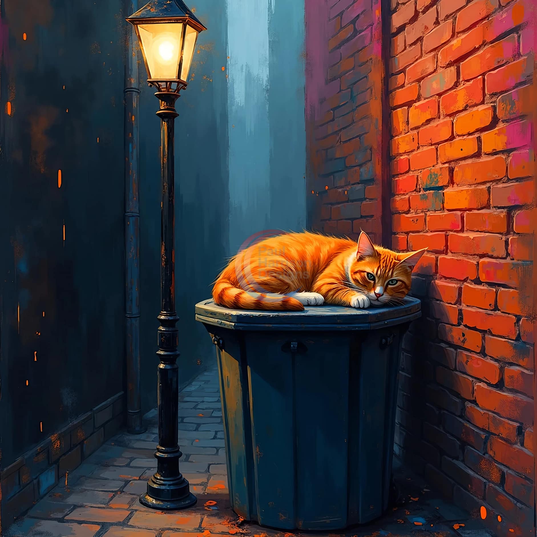 + Free ShippingThis is a digital painting in a vibrant, abstract style. The central figure is a Ginger Tom cat, lying curled up on top of a dustbin.