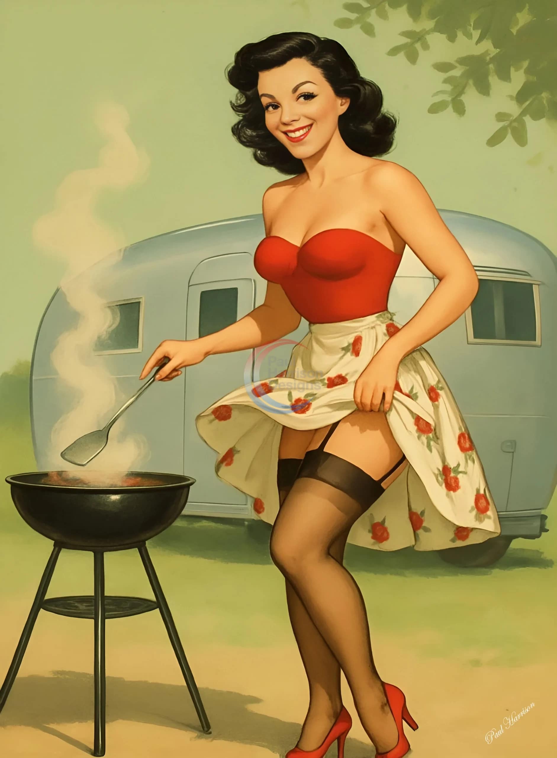 This is a vintage-style, digitally rendered illustration depicting a cheerful woman cooking outdoors.