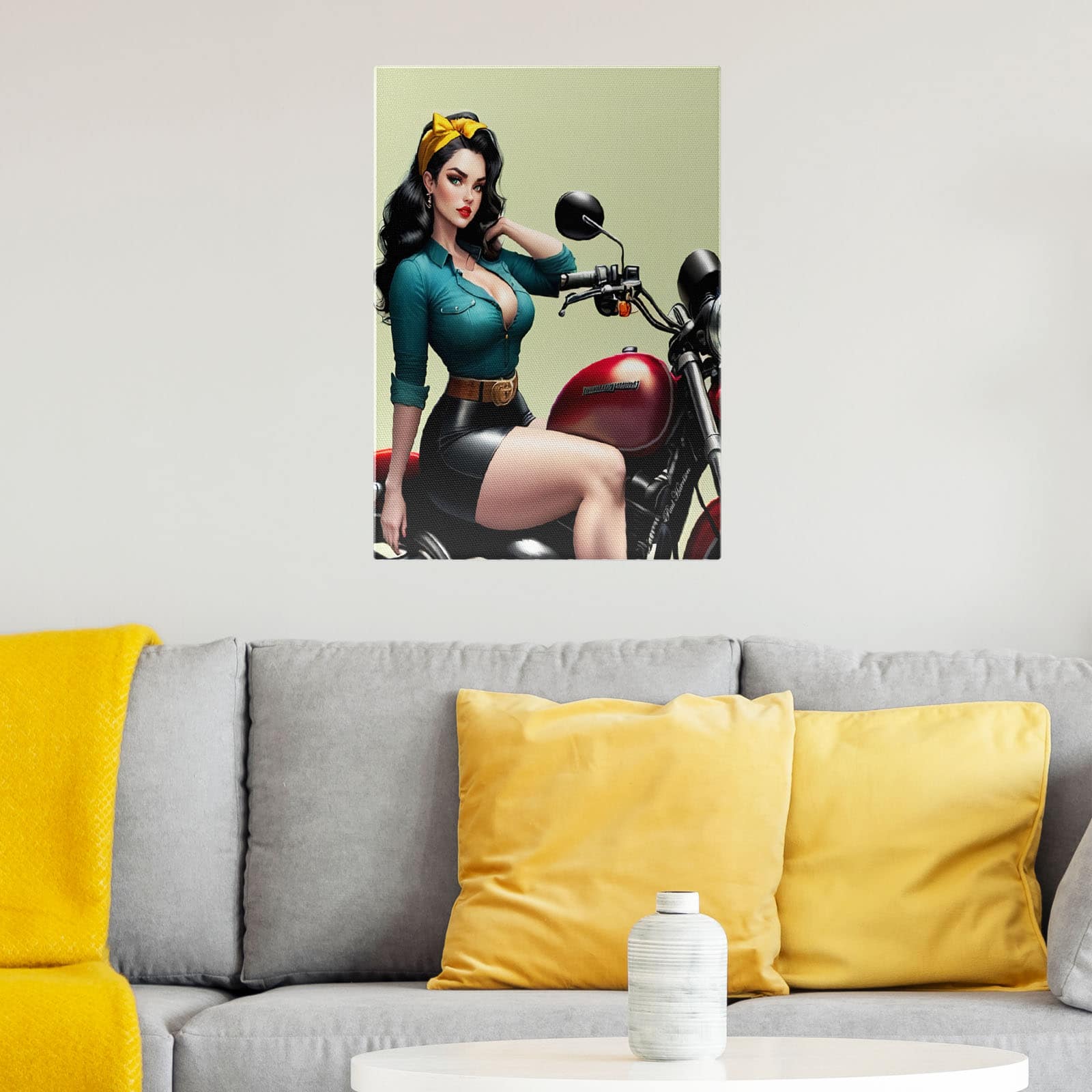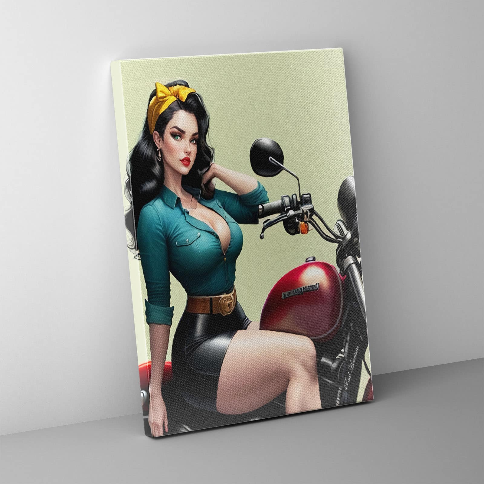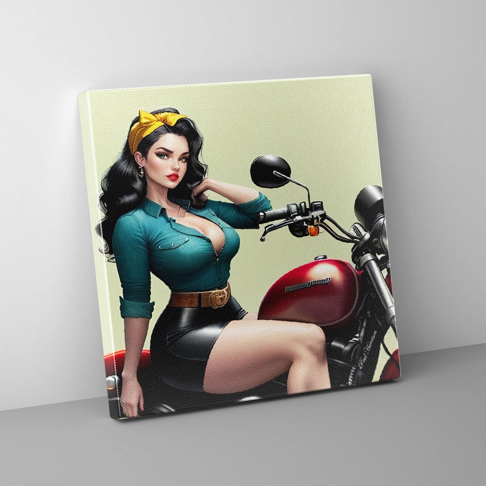 This is a vintage-style, color illustration of a woman sitting on a red and black motorcycle.