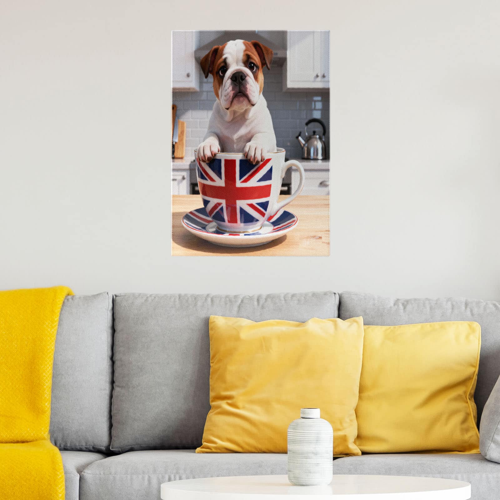 + Free ShippingAn image of a young English Bulldog puppy sitting inside a large, white ceramic teacup adorned with the British Union Jack flag.