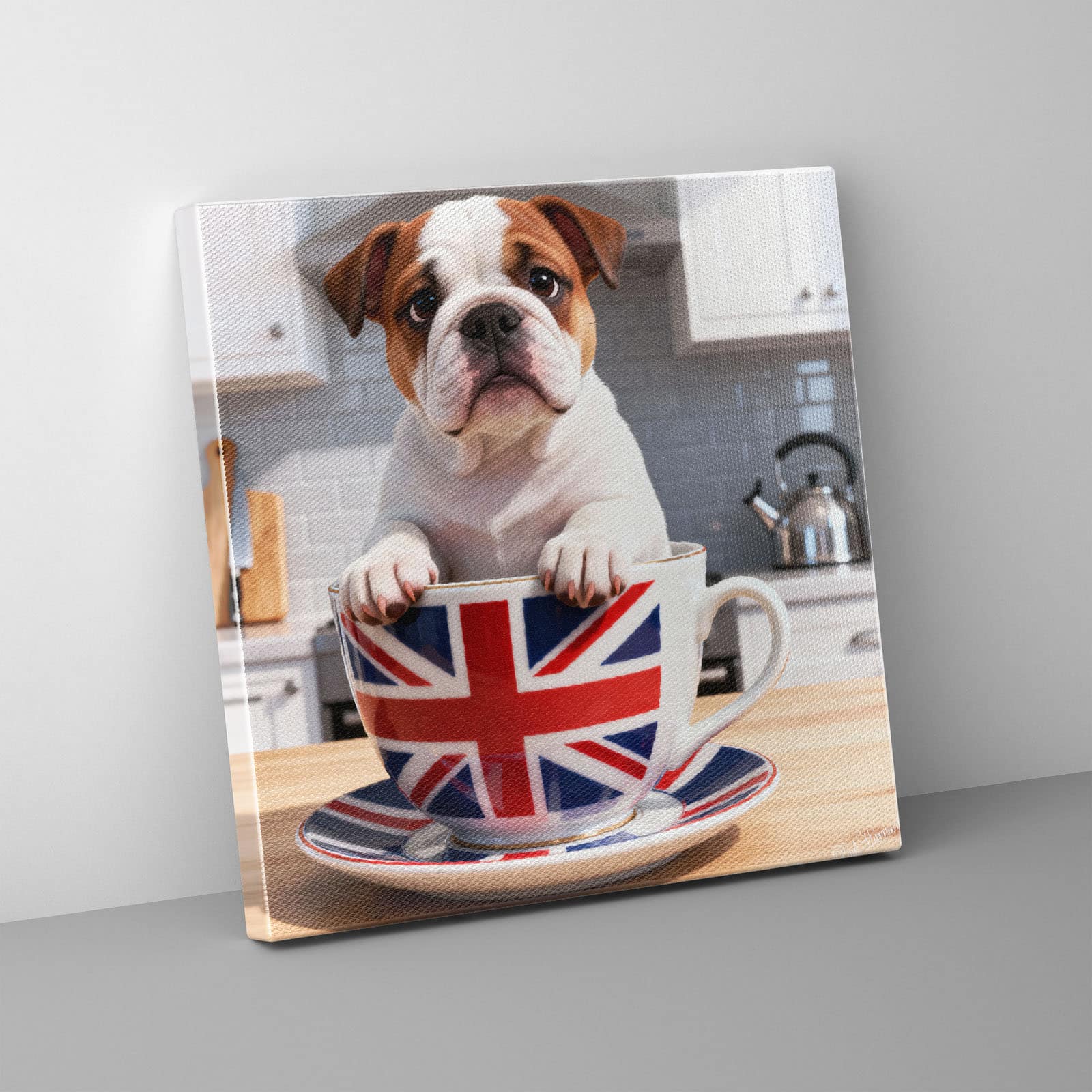 An image of a young English Bulldog puppy sitting inside a large, white ceramic teacup adorned with the British Union Jack flag.