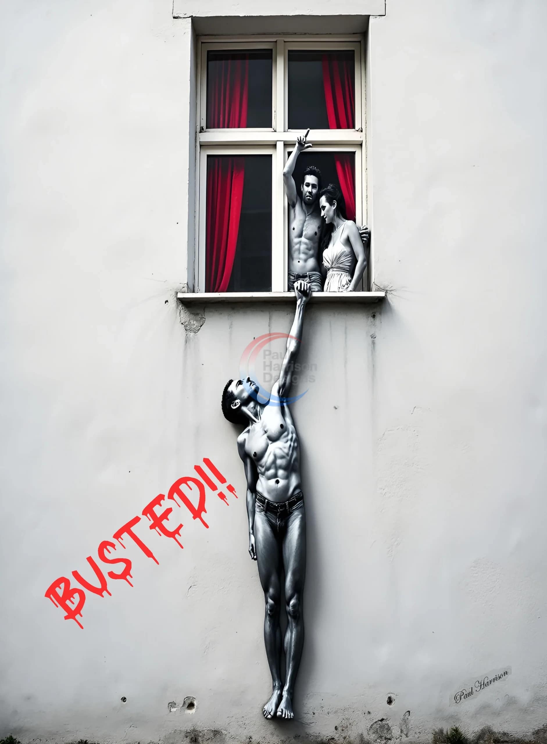 This is an image of a street art mural featuring a fleeing lover. The mural is painted in black and white, with a realistic style.