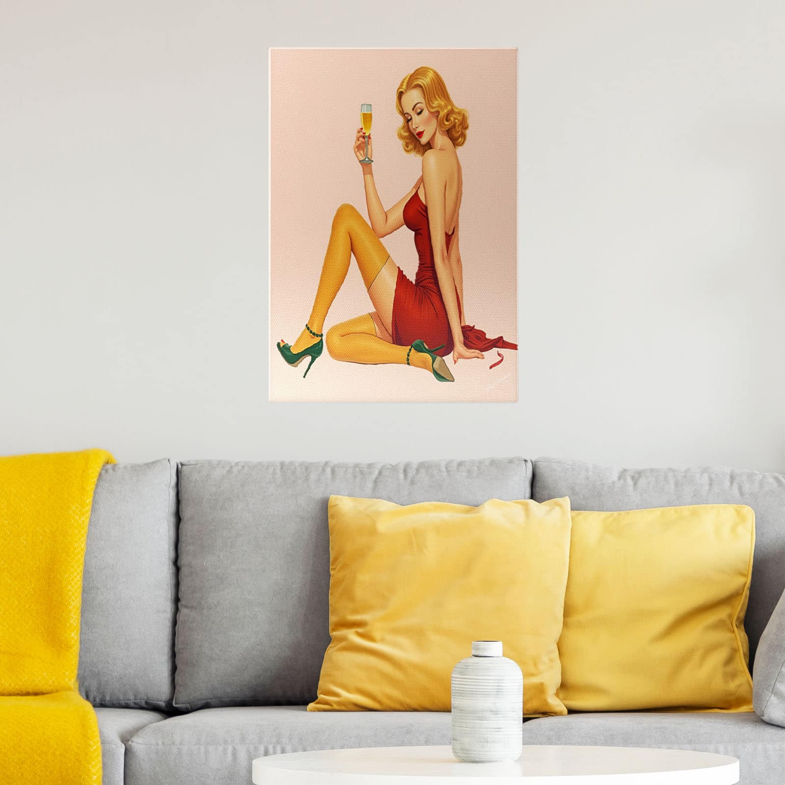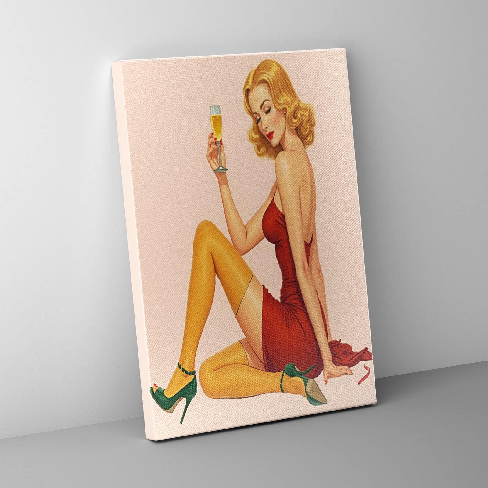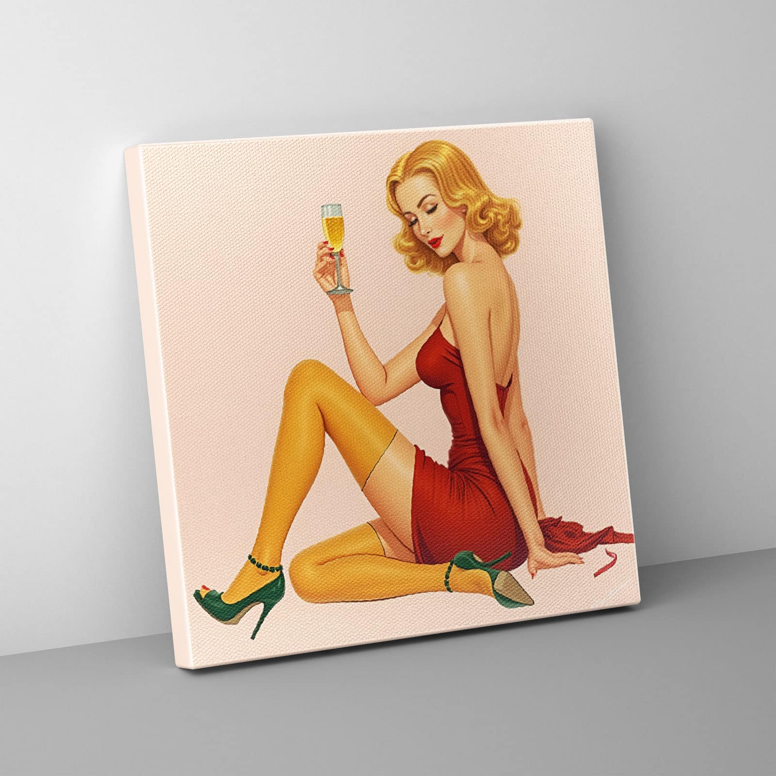 + Free ShippingVintage-style image of a glamorous woman sitting on the floor with a relaxed and seductive pose.