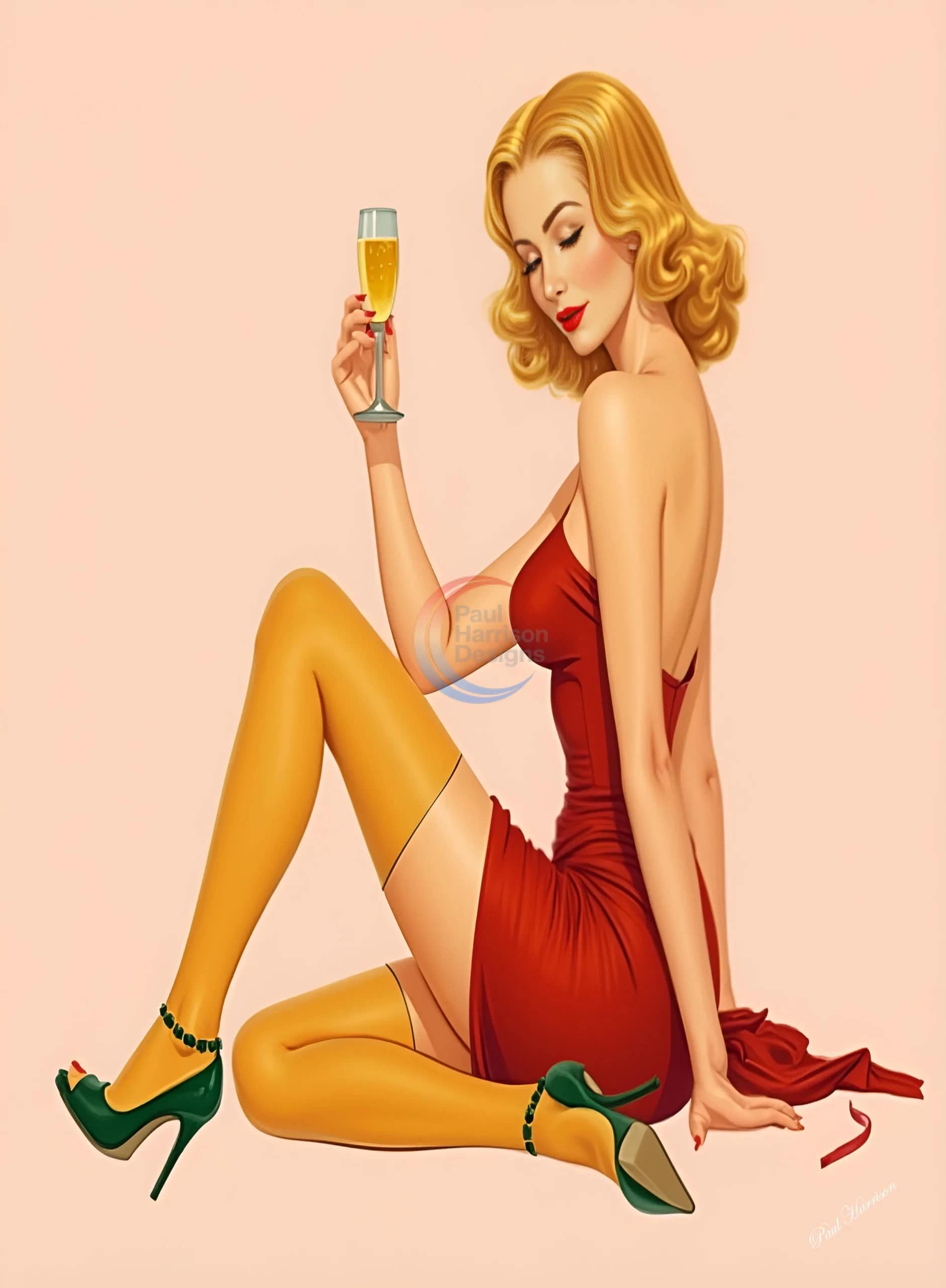 Vintage-style image of a glamorous woman sitting on the floor with a relaxed and seductive pose.