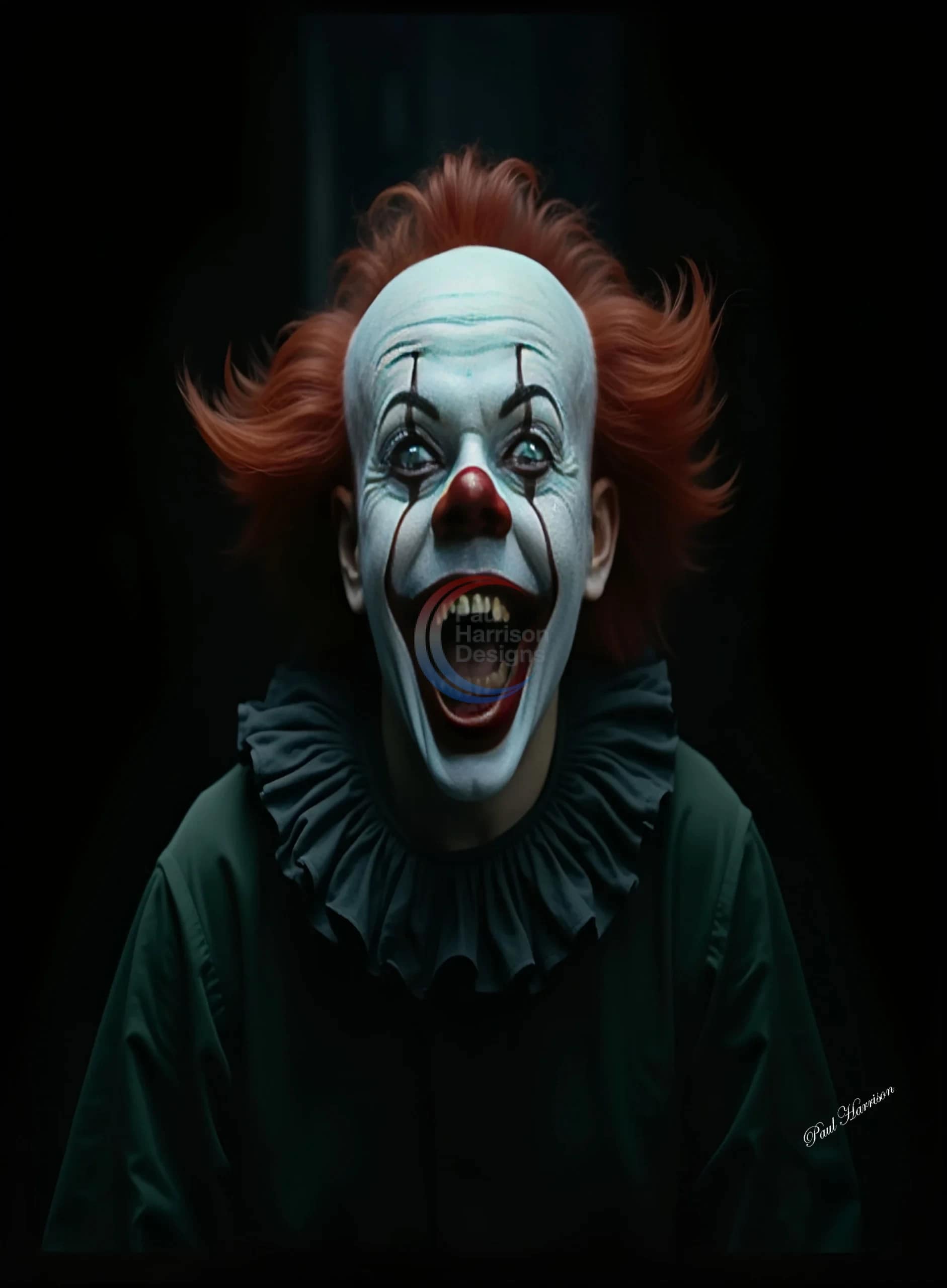 + Free ShippingThis is a dark, eerie photograph-style poster . The central focus is a close-up of a crazy, sinister looking clown with a white face, red nose, and black-painted eyebrows and lips.