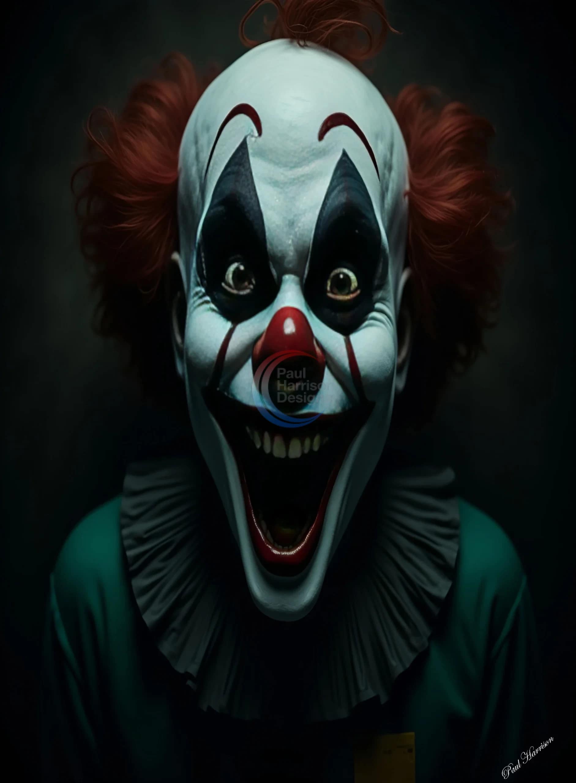 + Free ShippingThis is a dark, eerie photograph-style poster . The central focus is a close-up of a crazy, sinister looking clown with a white face, red nose, and black-painted eyebrows and lips.