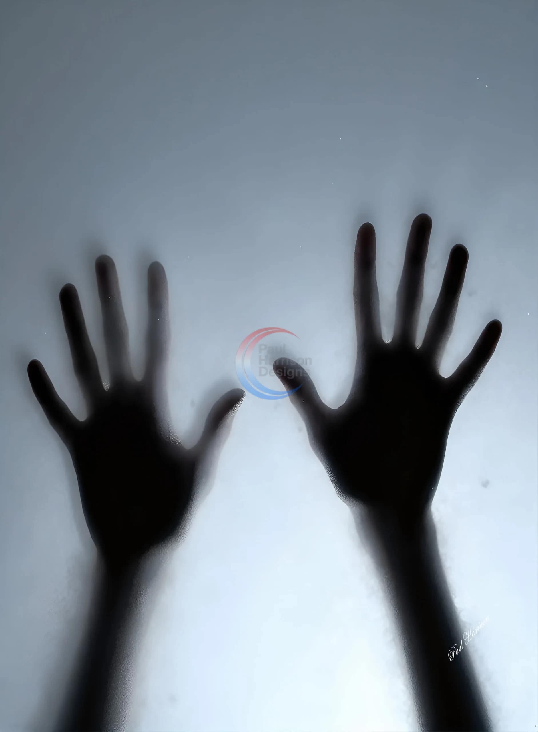 This image features a close-up, top-down view of two human hands pressed against a smooth, slightly reflective surface.