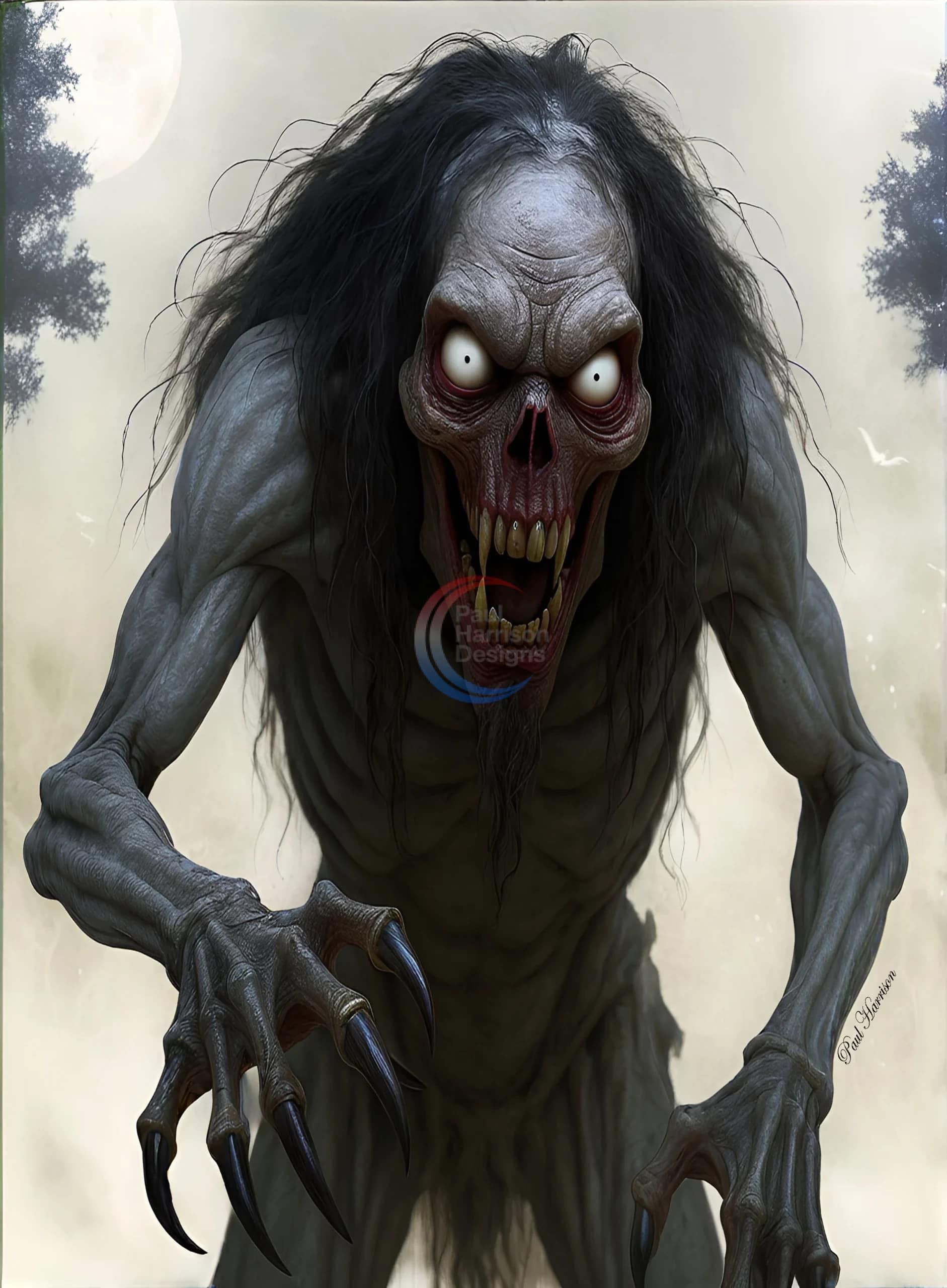 + Free ShippingThis is a highly detailed, digital CGI illustration of a terrifying, humanoid monster. The creature stands in a menacing, crouched position, with its head lowered and eyes wide open, giving it an intense, aggressive expression.