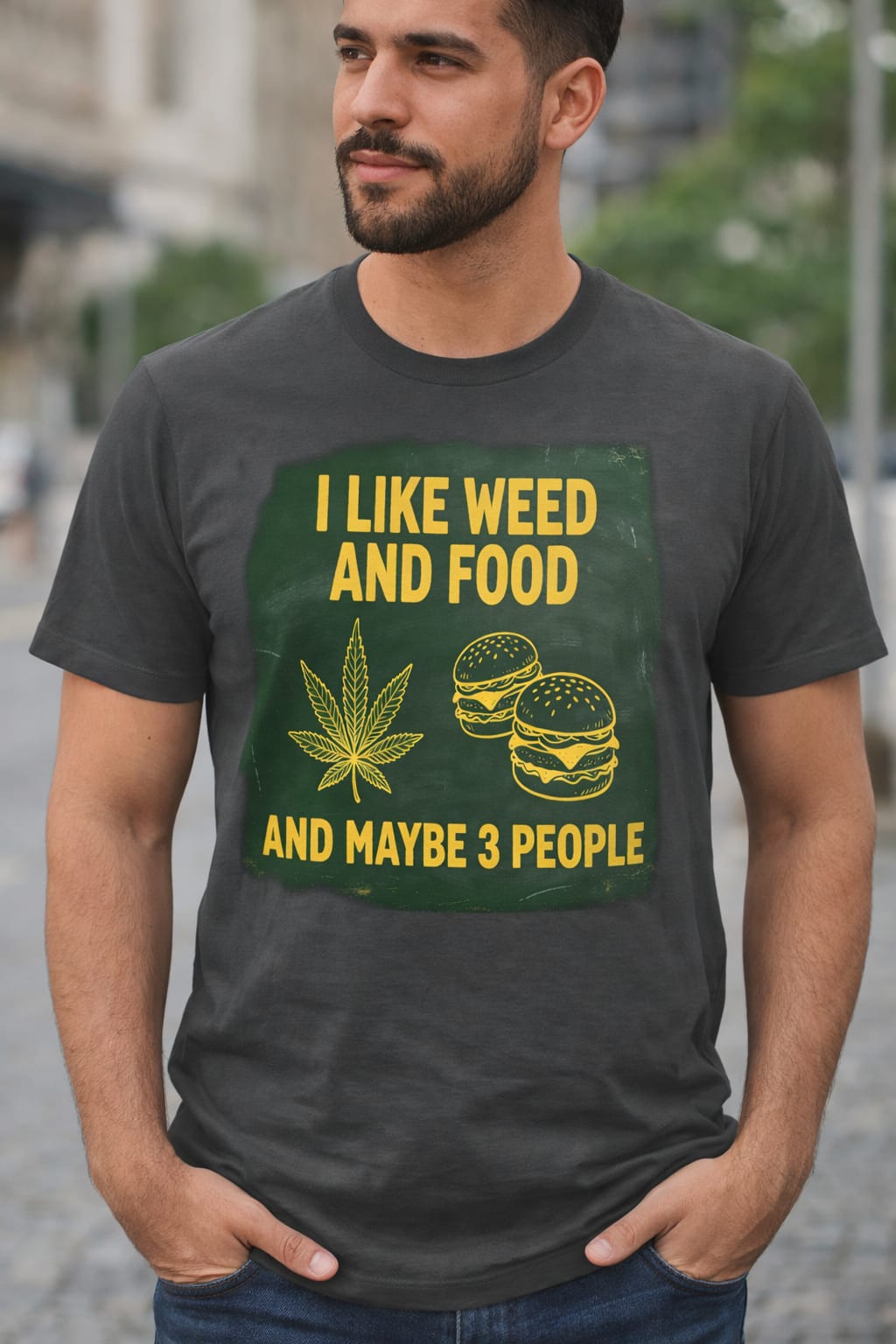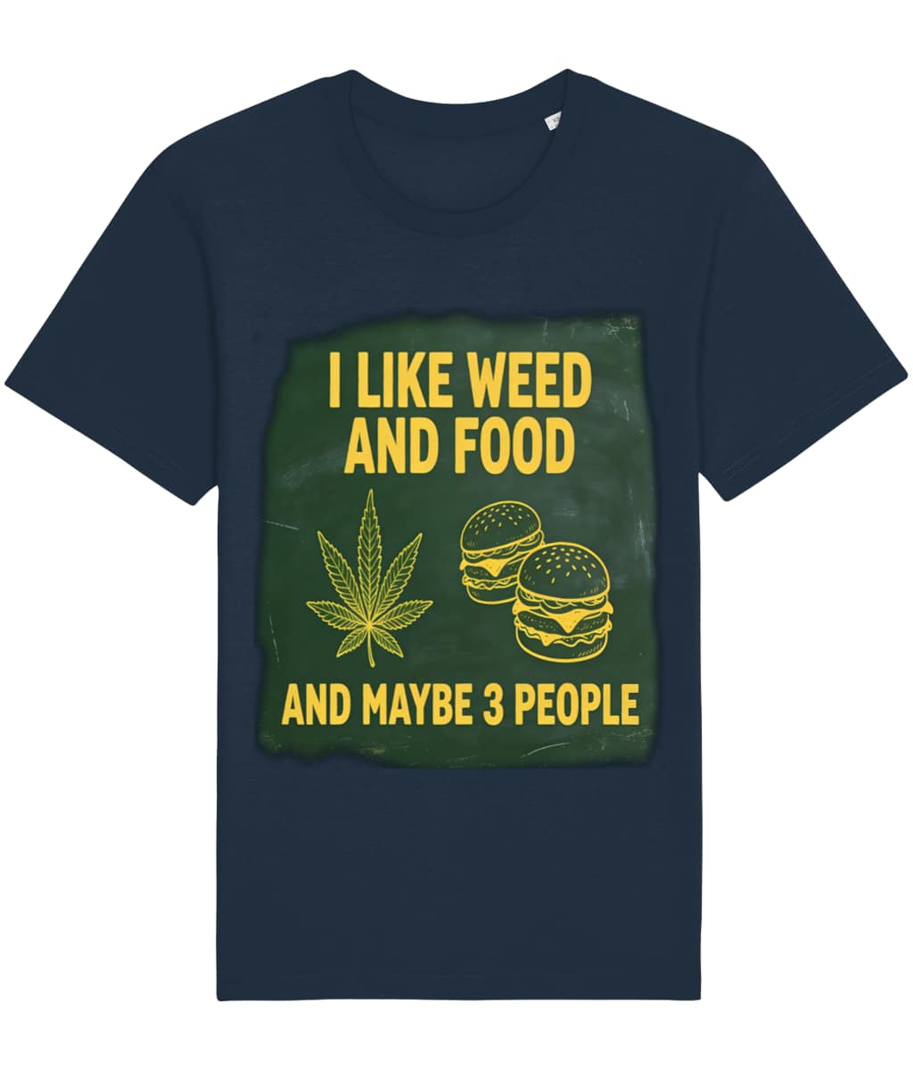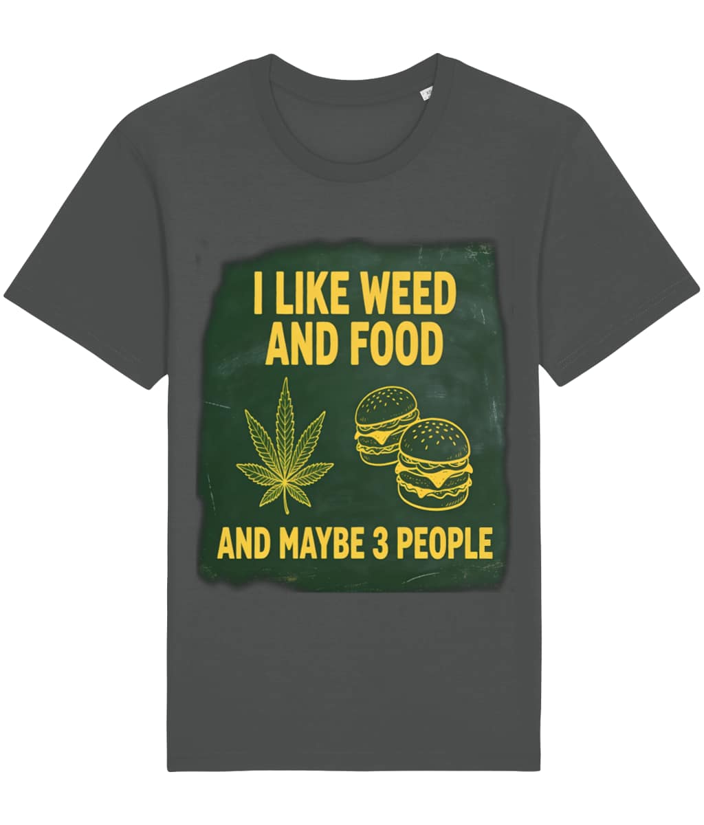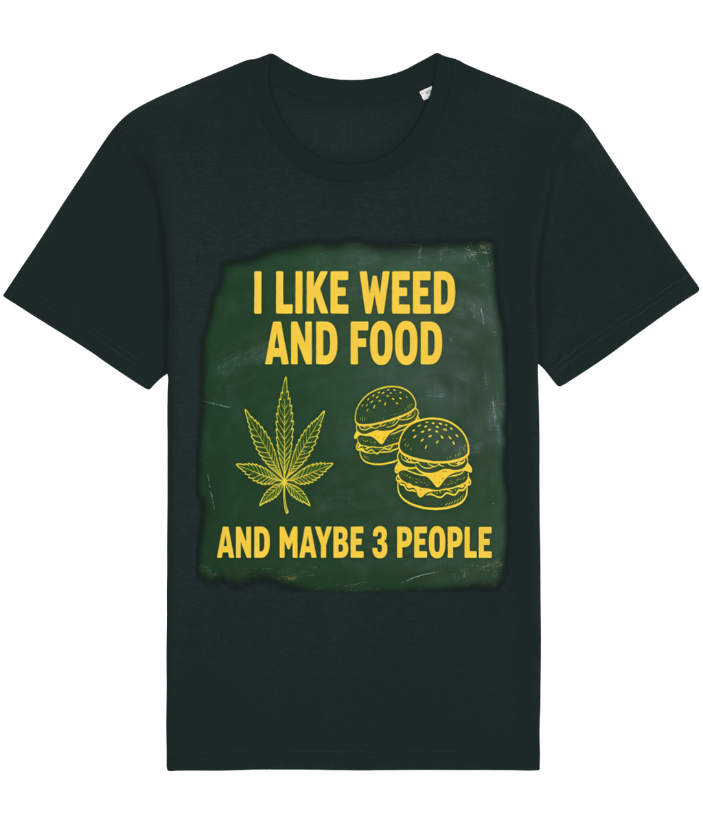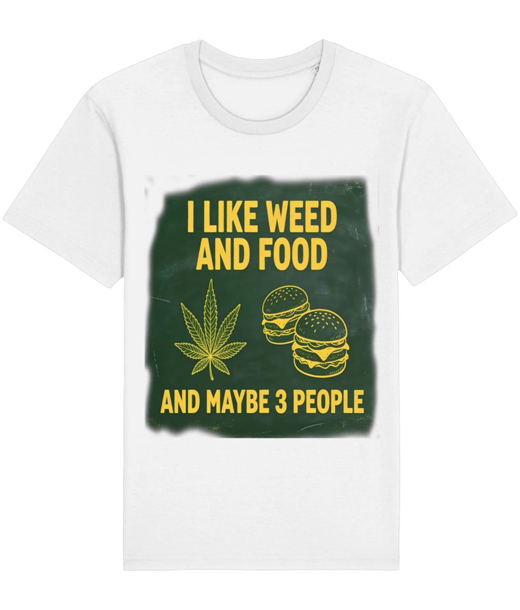 Show off your priorities with this bold and hilarious statement t-shirt! The “I LIKE WEED AND FOOD AND MAYBE 3 PEOPLE” graphic t-shirt is perfect for anyone who appreciates good vibes, great eats, and a very small social circle.