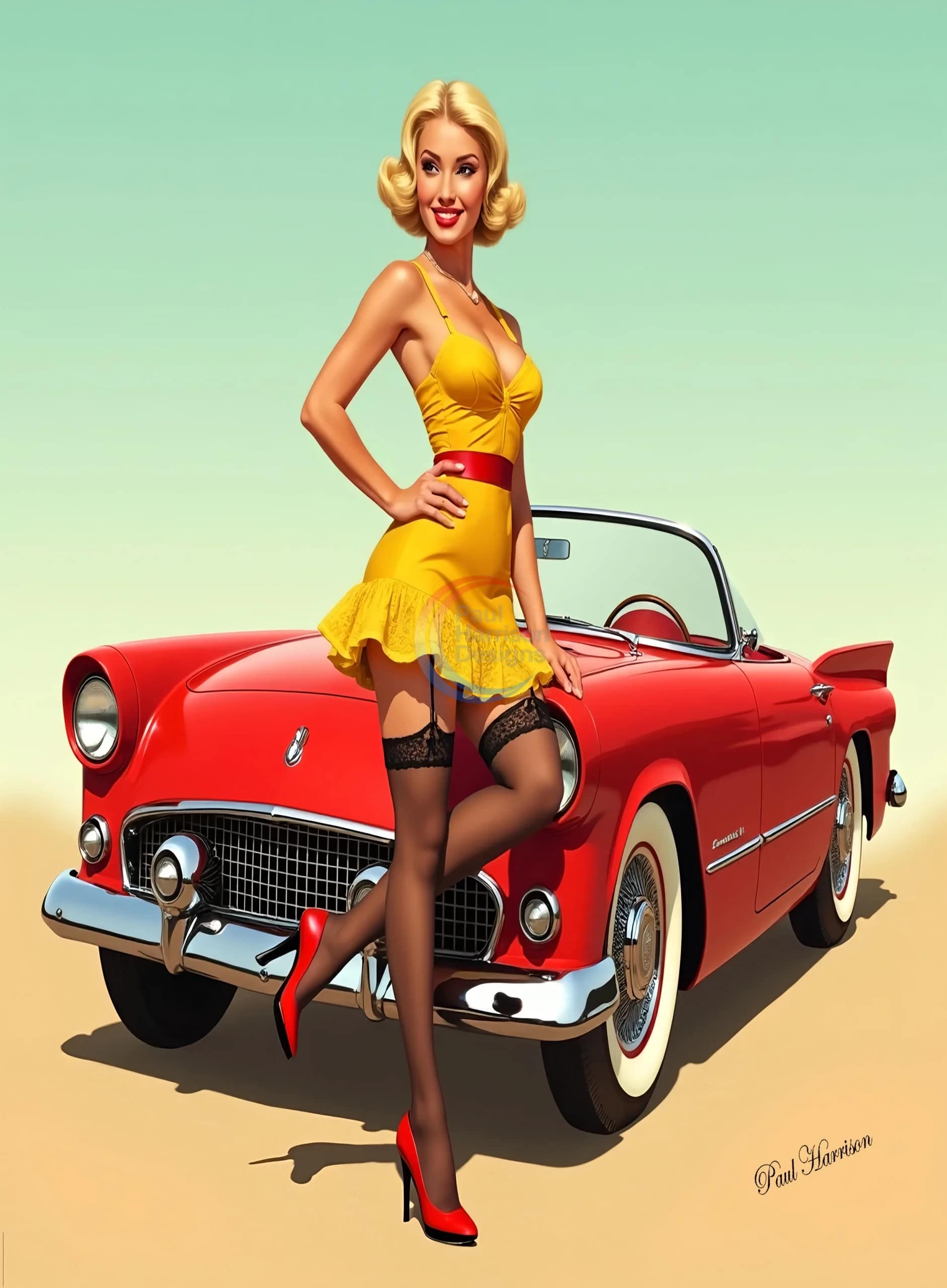 llustrated image in a retro, hyper realistic, pin-up style. The central figure is a confident, smiling woman with short, blond bobbed hair and fair skin.