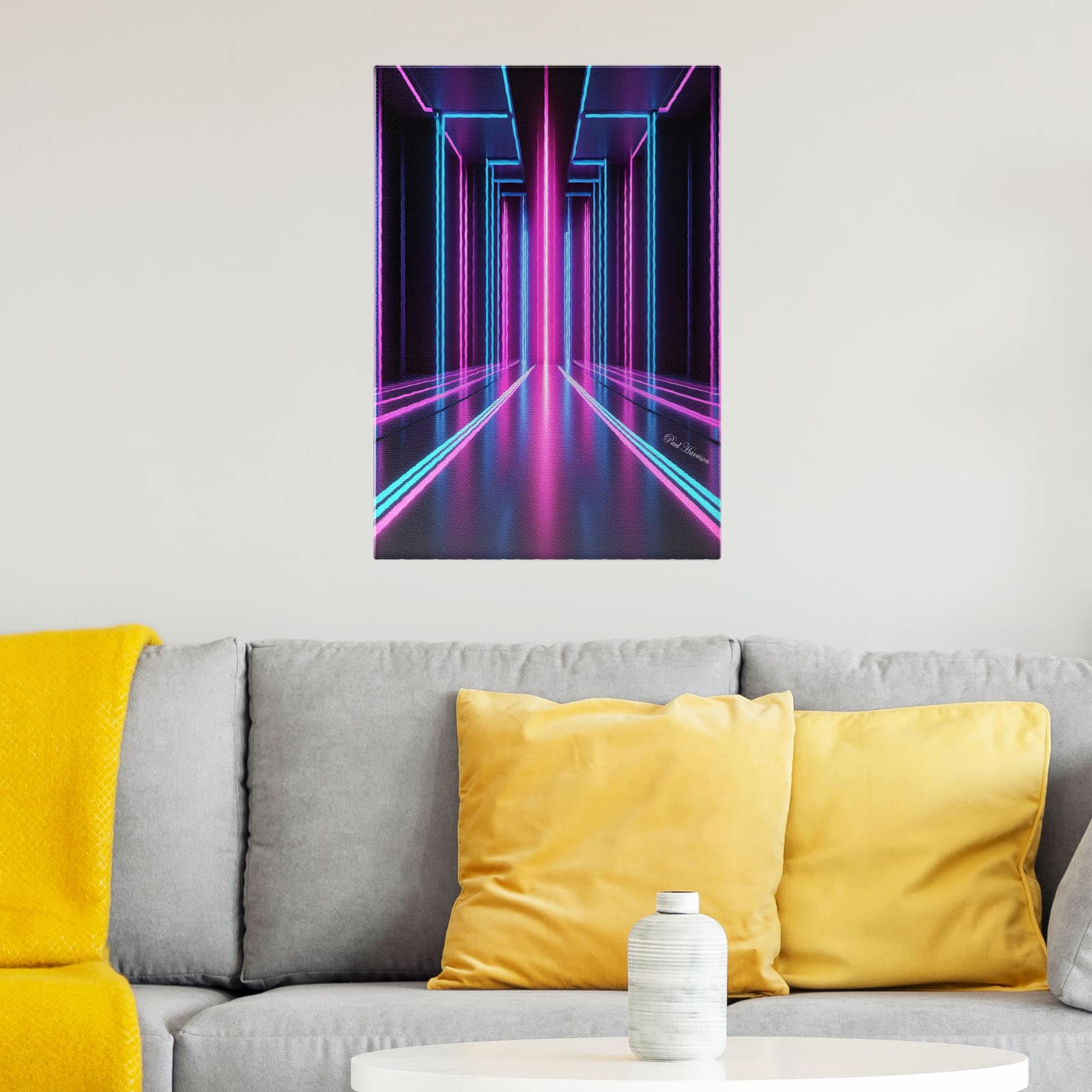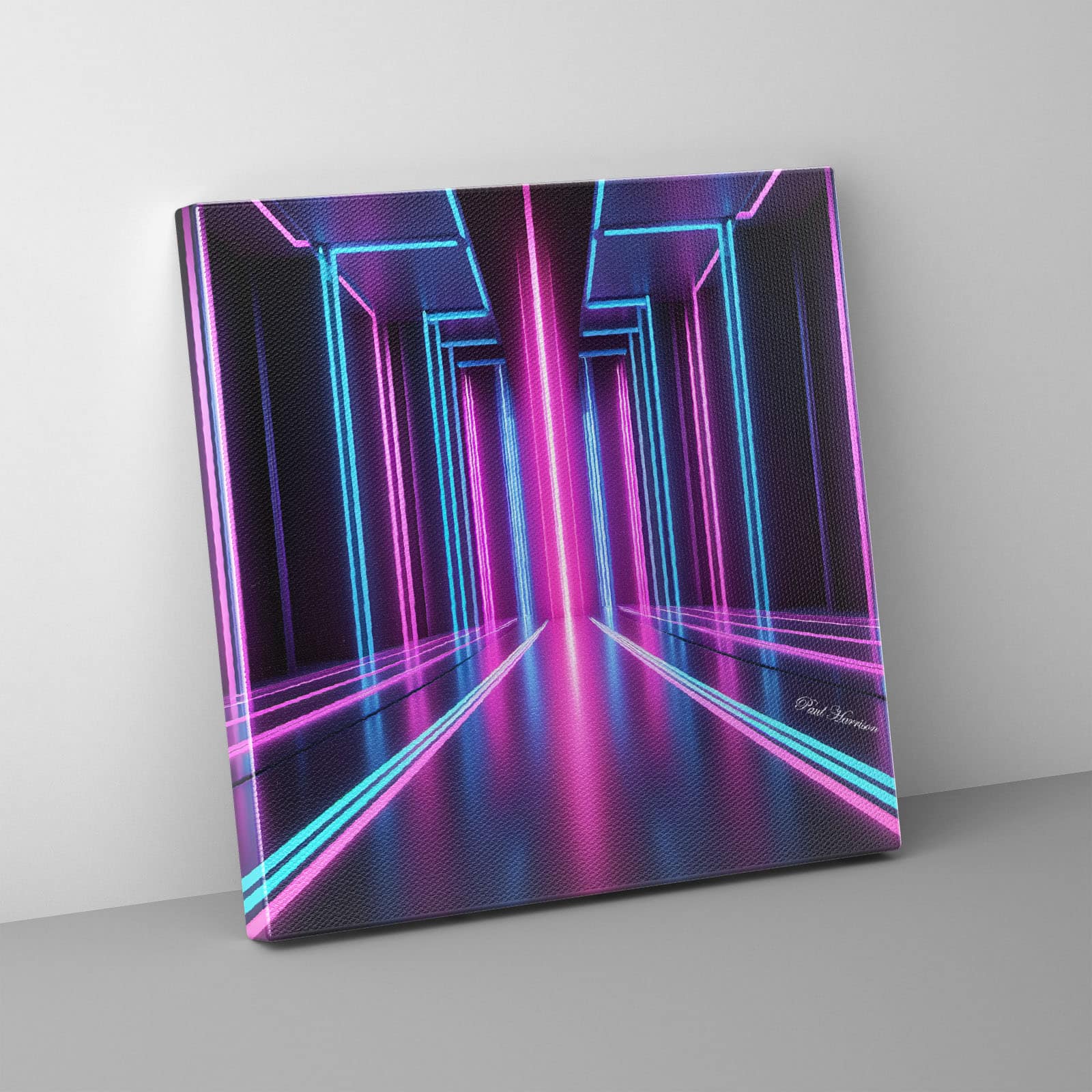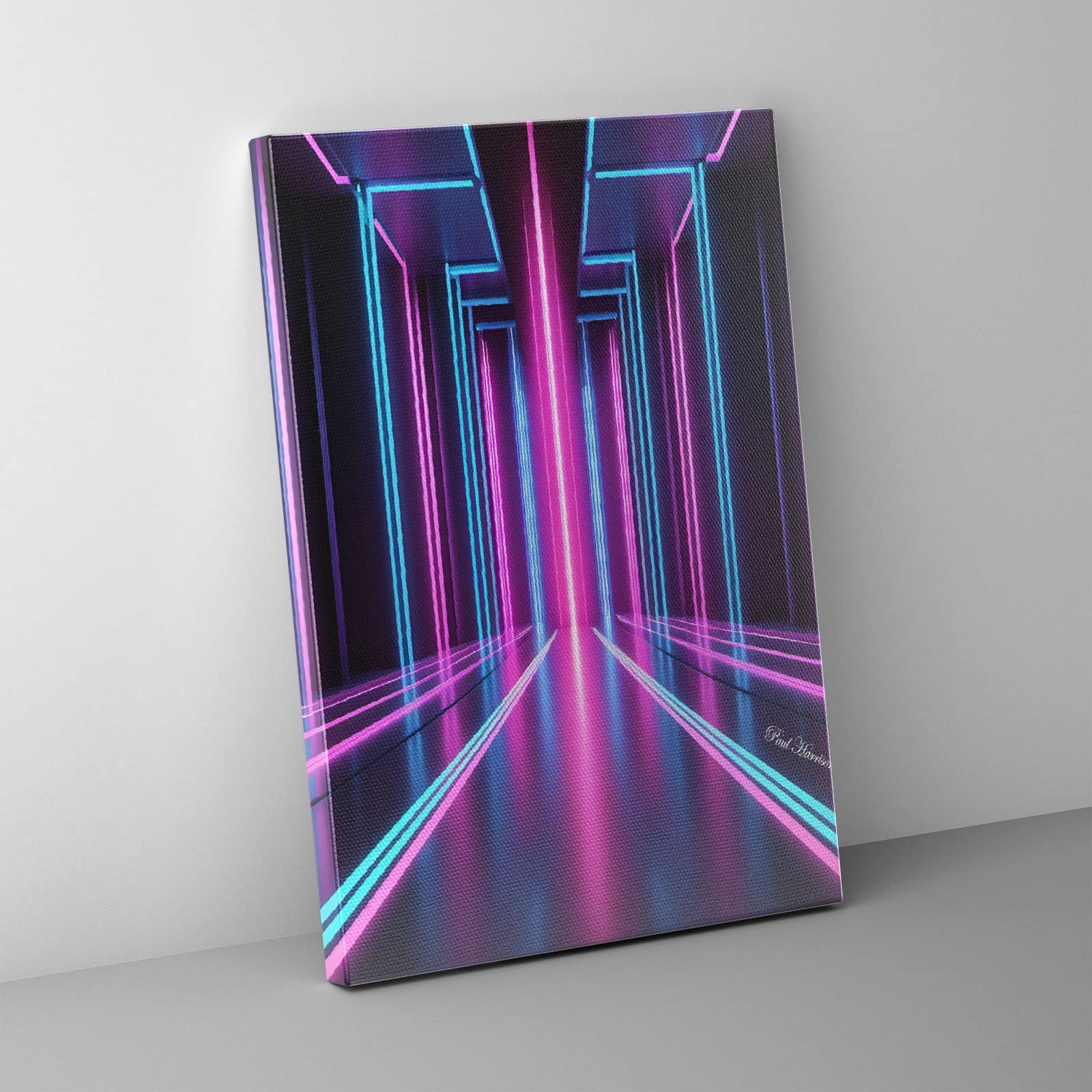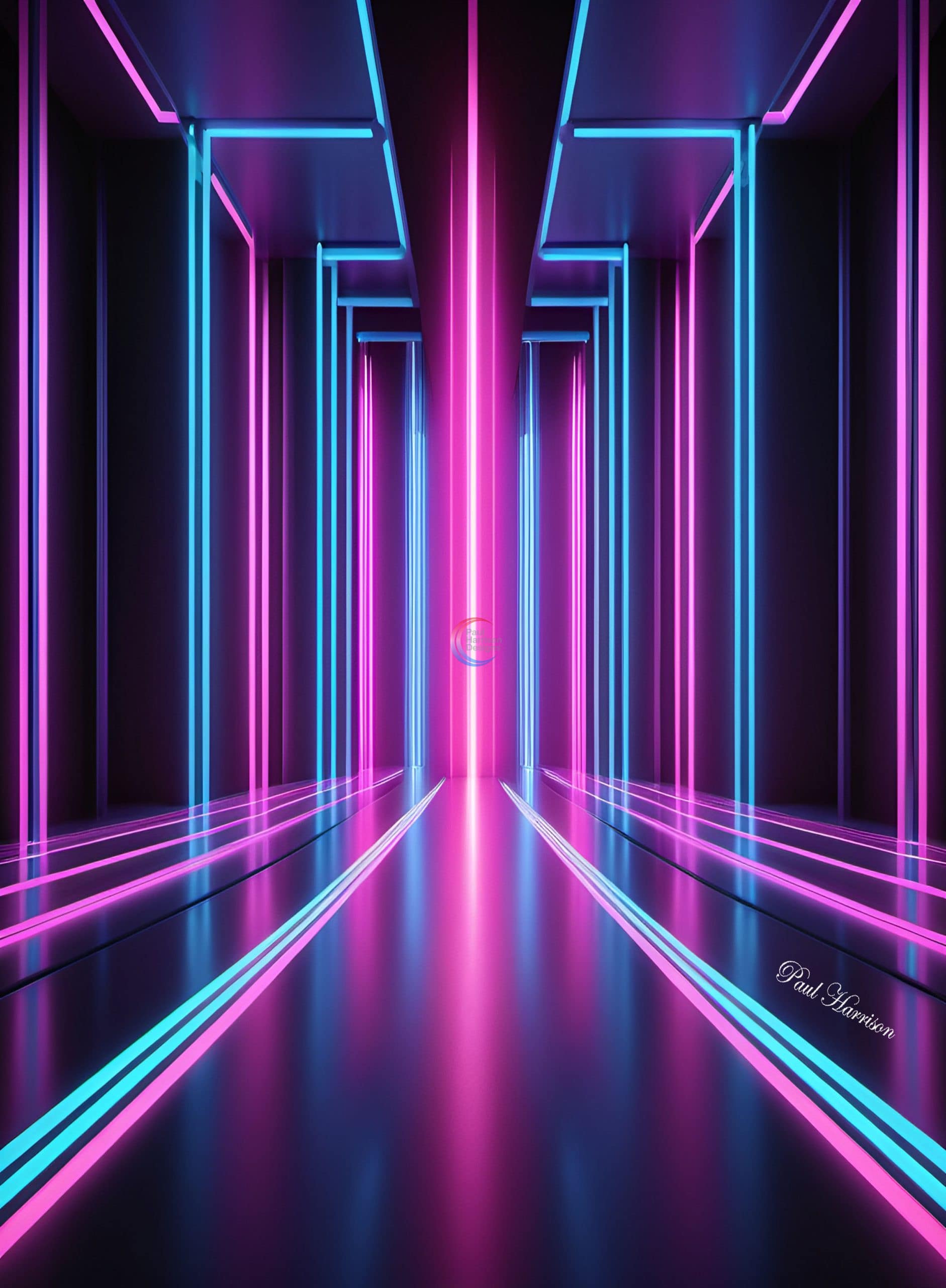 + Free ShippingThis is a digitally created CGI image featuring a futuristic, abstract scene. The composition showcases a symmetrical arrangement of vertical neon light lines, which are predominantly in shades of pink, blue, and purple.