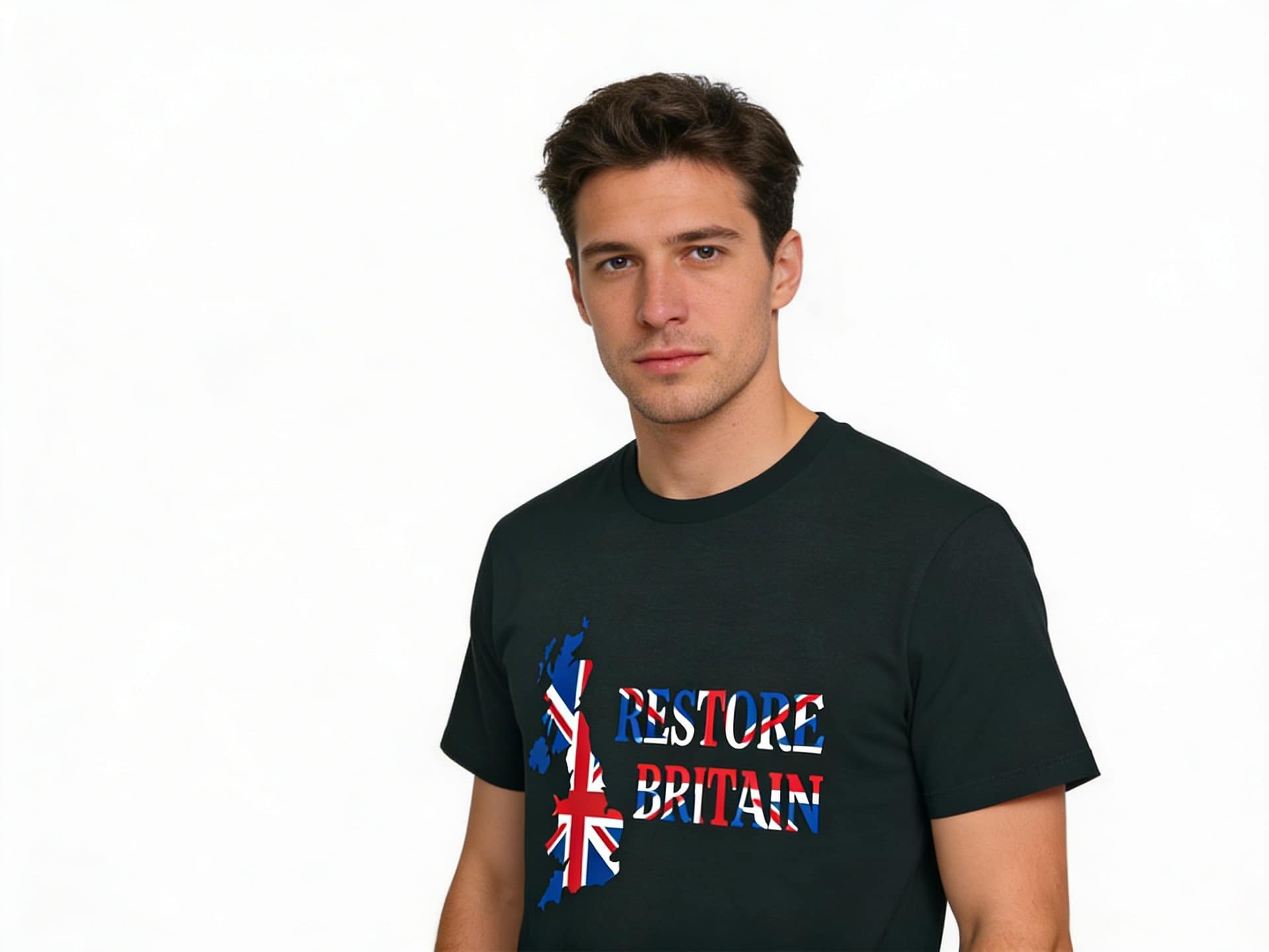 Restore Britain T-shirt dipicting the Union Flag colours.