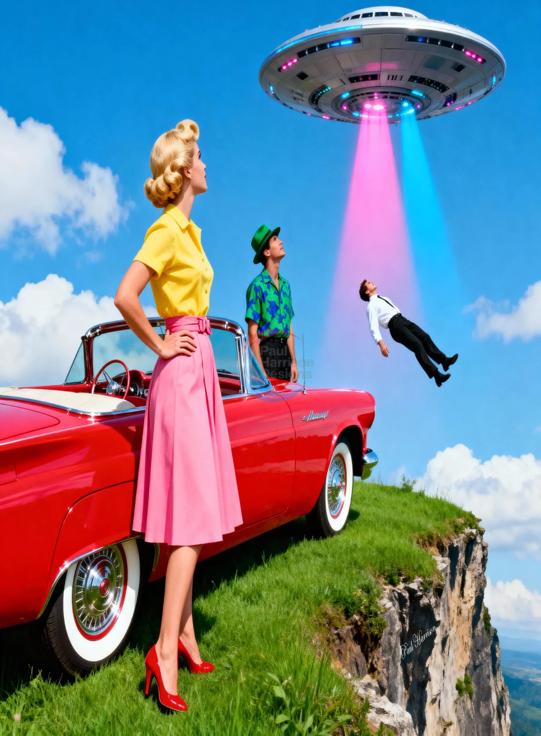 + Free ShippingThis is a vibrant, digitally-created photograph with a retro-futuristic theme. The scene is set on a grassy cliff under a bright blue sky with scattered white clouds.