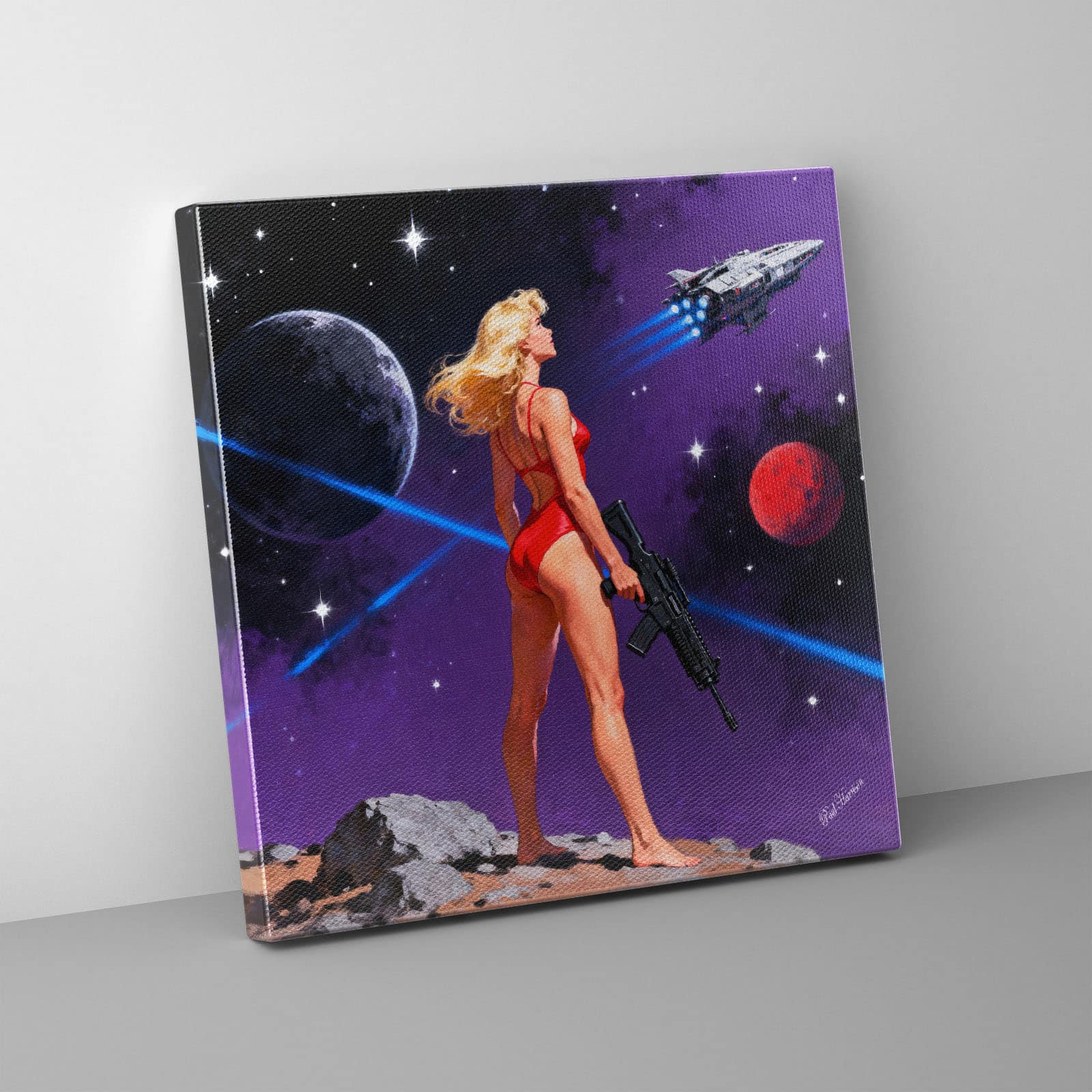 + Free ShippingThis is a digital painting in a vibrant, comic-book style. The central figure is a blonde woman standing on a rocky, barren surface under a starry, purple-hued space sky.
