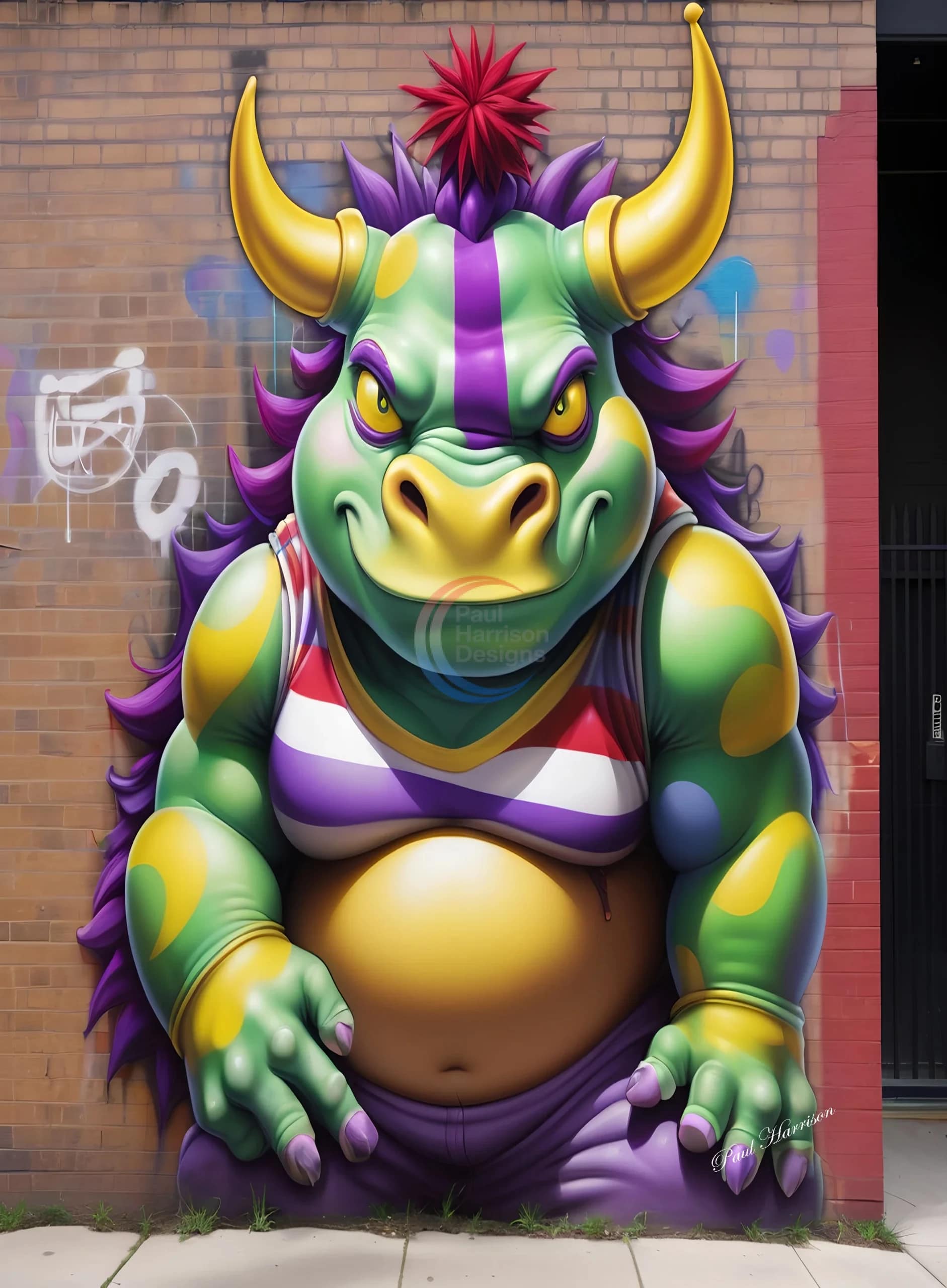 + Free ShippingThis is a vibrant, hyper-realistic image of a colorful graffiti mural on a brick wall. The central figure is a large, cartoonish, green-purple rhinoceros.