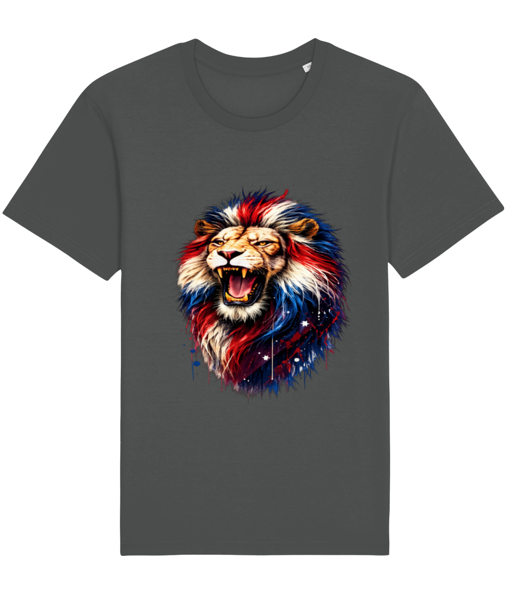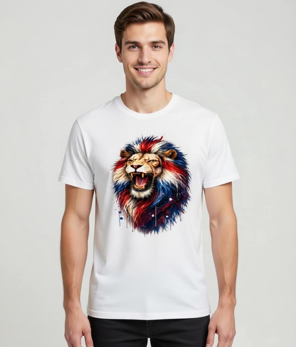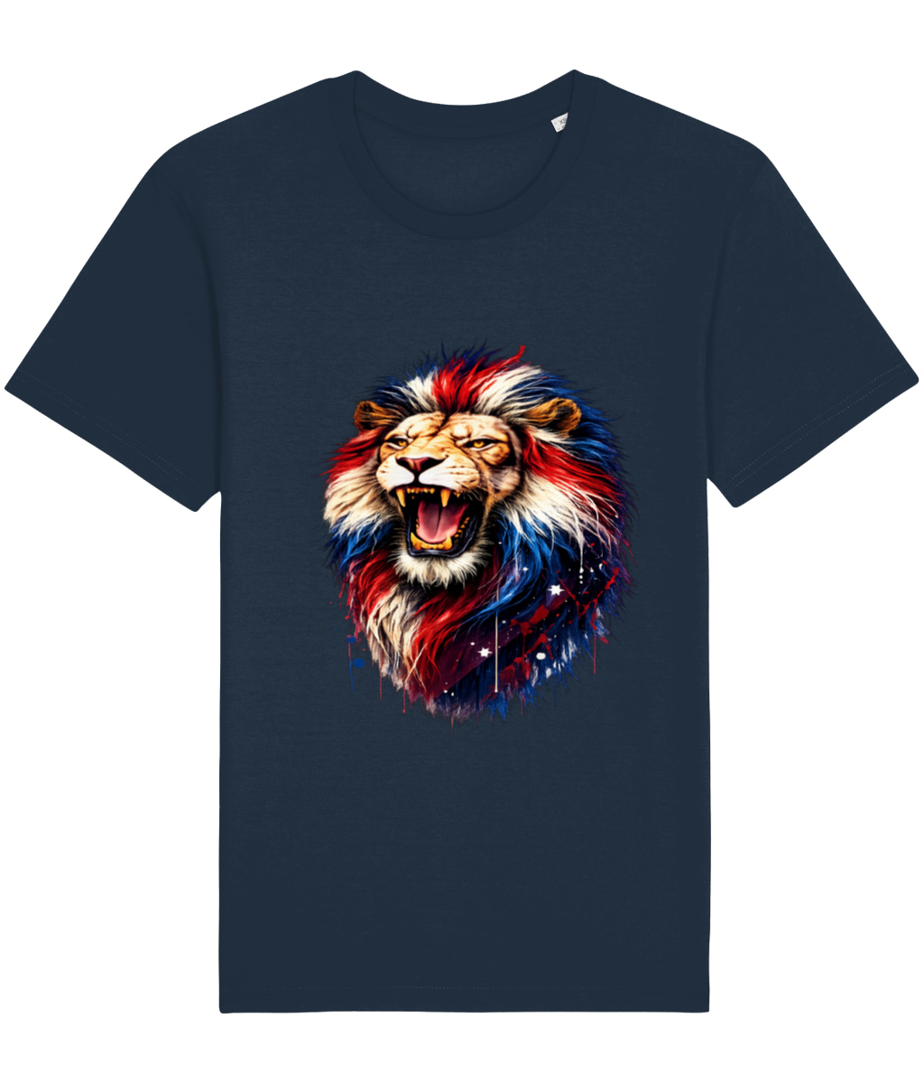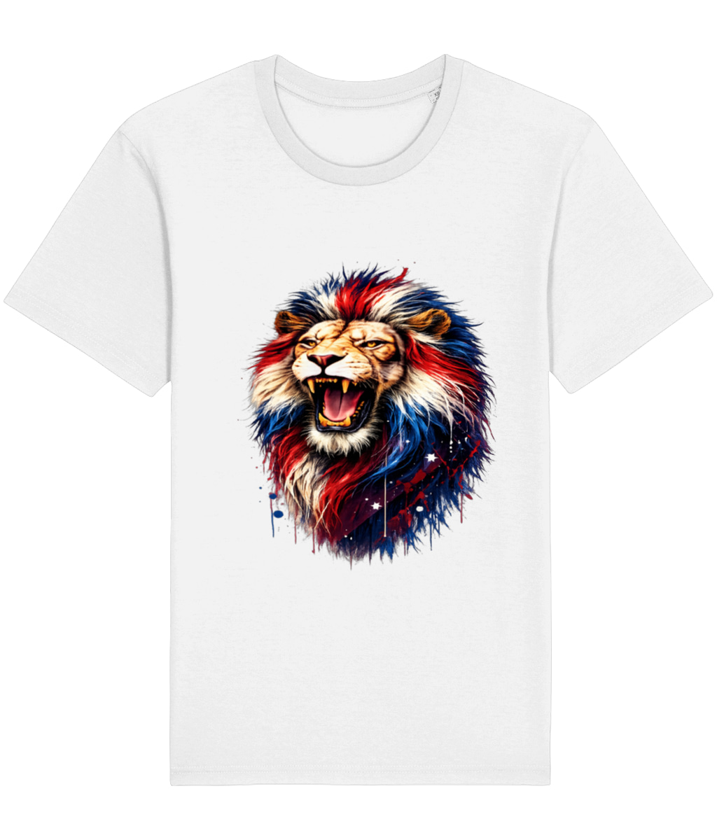 Unleash your inner strength with this eye-catching Patriotic Roaring Lion graphic t-shirt! Featuring a fierce, majestic lion roaring proudly, its powerful mane explodes in vibrant red, white, and blue splashes with artistic drips, stars, and cosmic accents – a perfect fusion of wild power and British spirit.Crafted on a premium soft white cotton blend unisex t-shirt, this design pops with high-resolution, full-color print that stays vibrant wash after wash. The roaring lion symbolizes courage, leadership, and unbreakable resolve – making it an ideal choice for patriots, veterans, everyday bold statements, or anyone who refuses to back down.