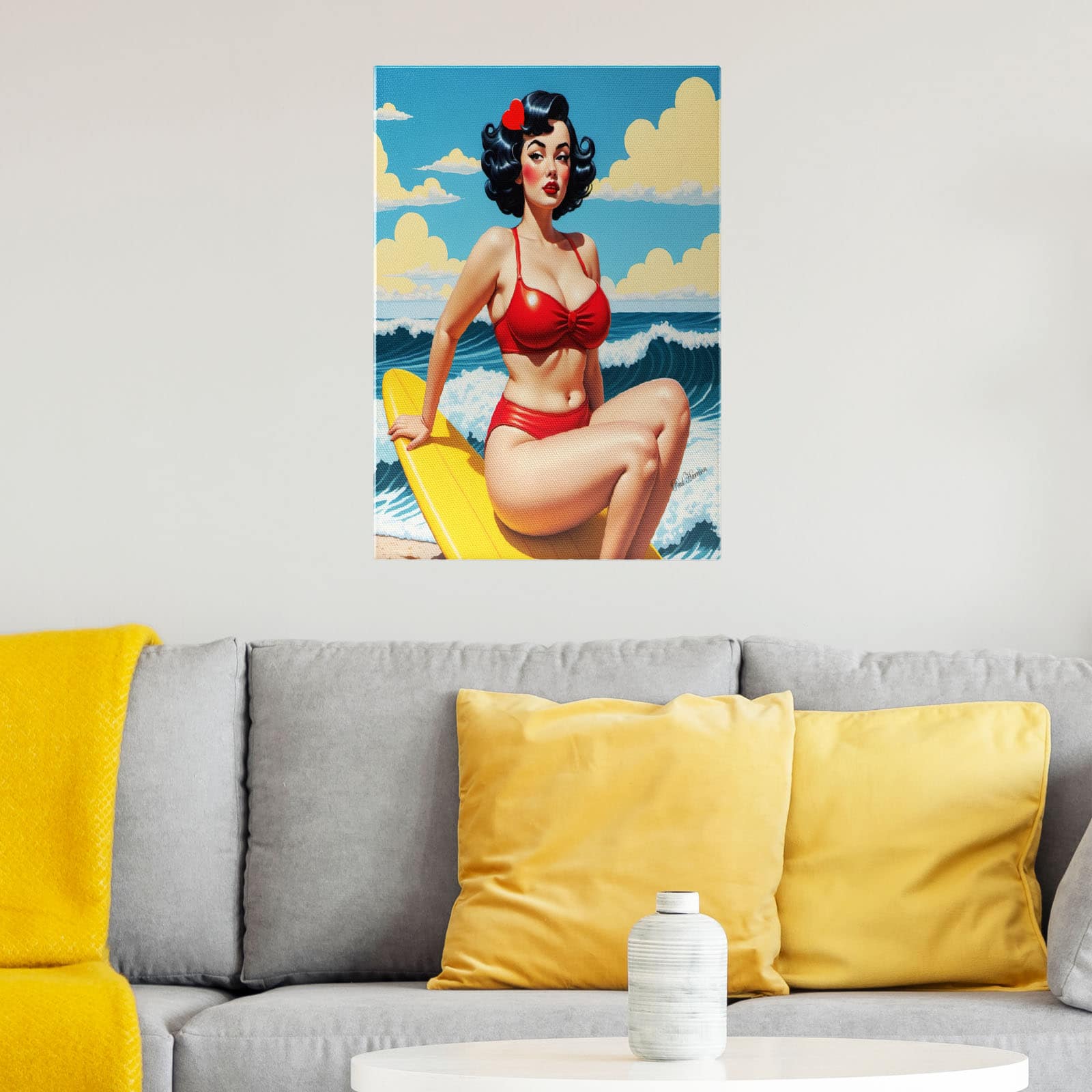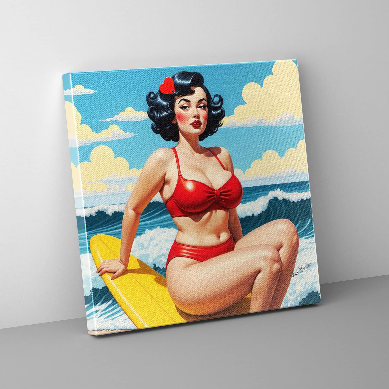 + Free ShippingHyper realistic, retro, pop-art style. It features a curvy woman with a fair skin tone, sitting on a yellow surfboard against a bright blue sky