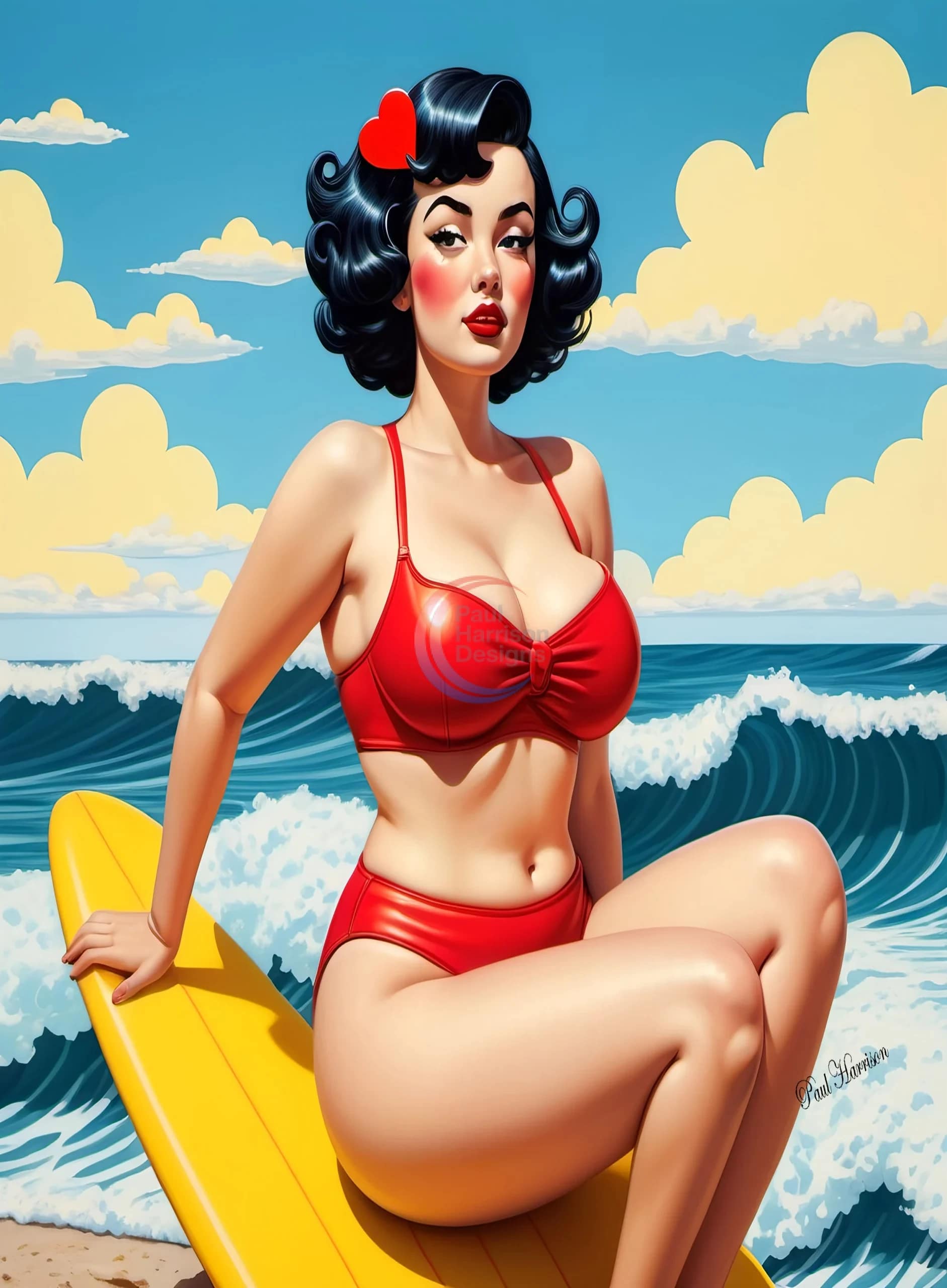 Hyper realistic, retro, pop-art style. It features a curvy woman with a fair skin tone, sitting on a yellow surfboard against a bright blue sky.