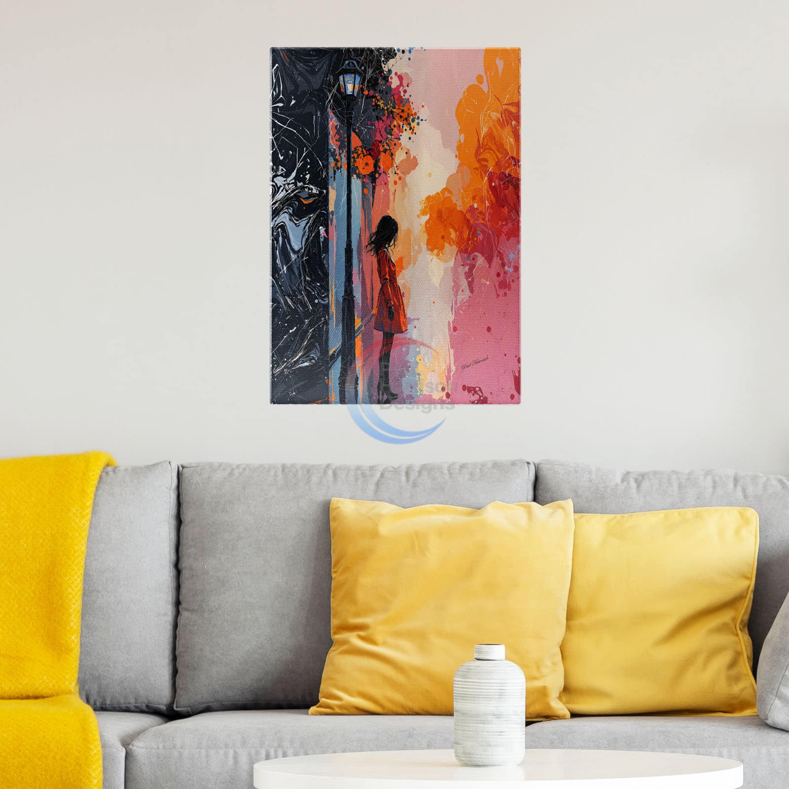 The overall style of the artwork is modern and expressive, with a focus on bold colors and abstract patterns. The woman’s silhouette is outlined clearly against the vivid backdrop, emphasizing her solitude.