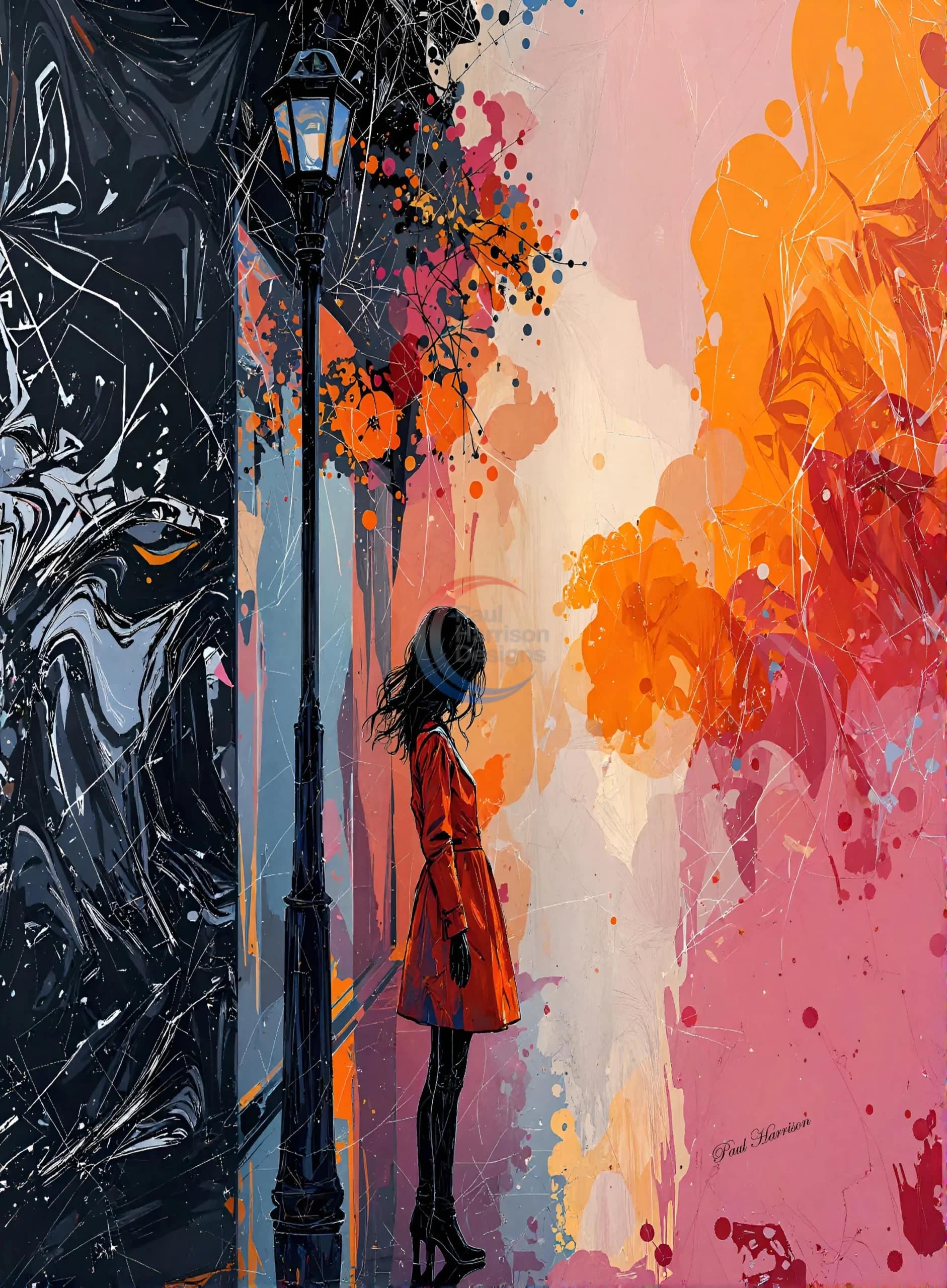 The overall style of the artwork is modern and expressive, with a focus on bold colors and abstract patterns. The woman’s silhouette is outlined clearly against the vivid backdrop, emphasizing her solitude.