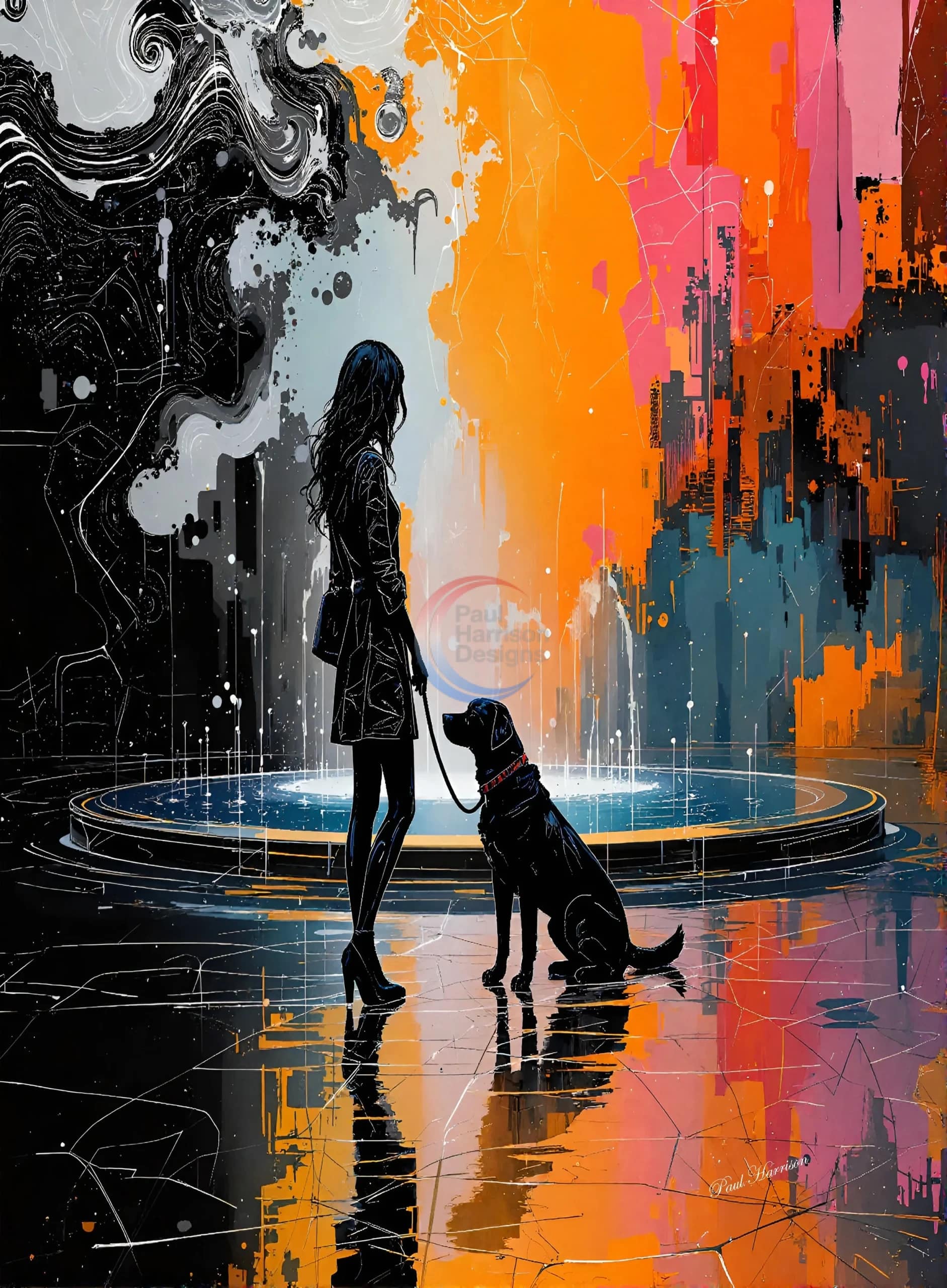 + Free ShippingThis is a digital illustration in a contemporary, abstract style. The image depicts a silhouette of a woman standing on a wet, reflective surface, holding a leash attached to a black dog sitting obediently beside her.