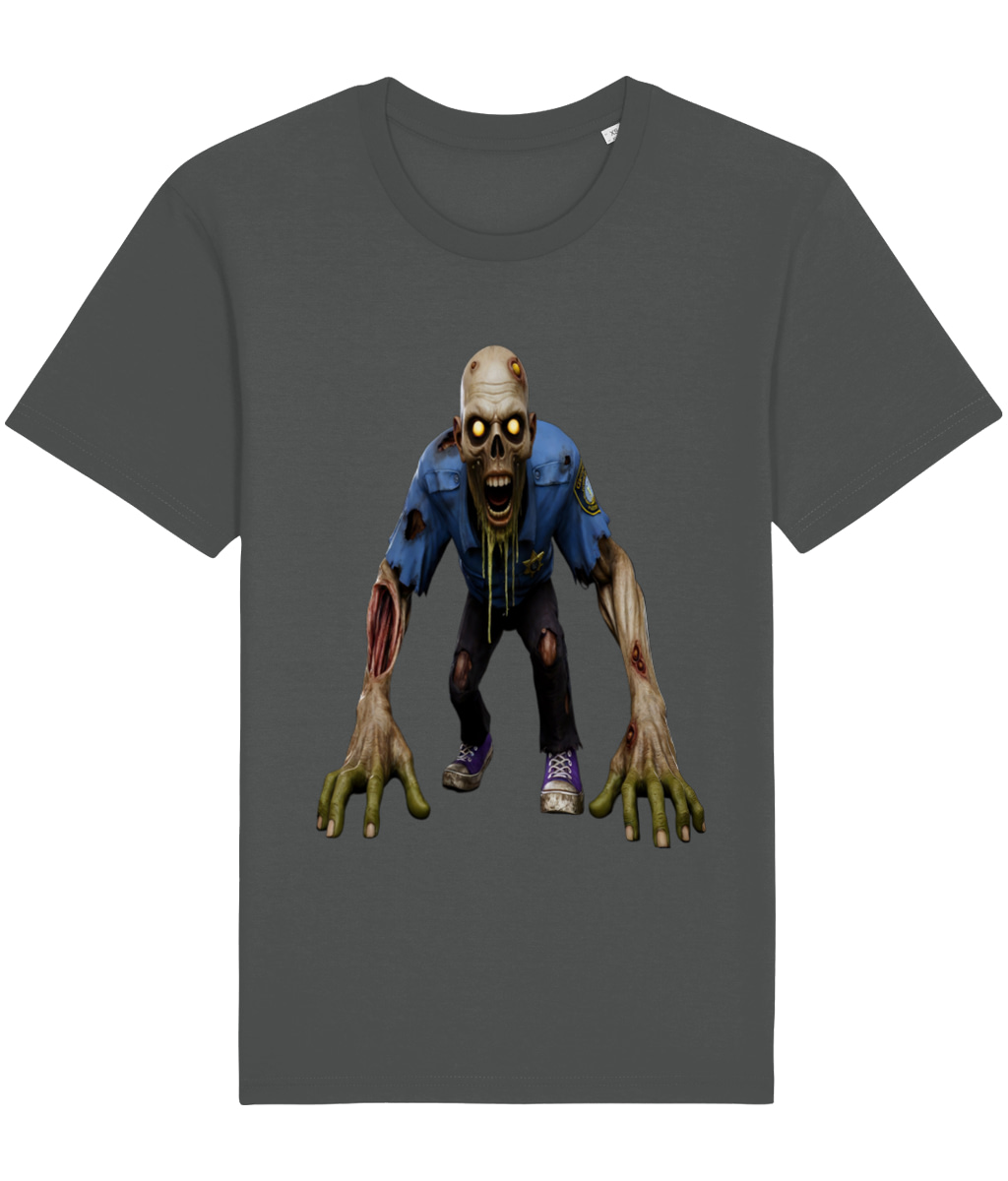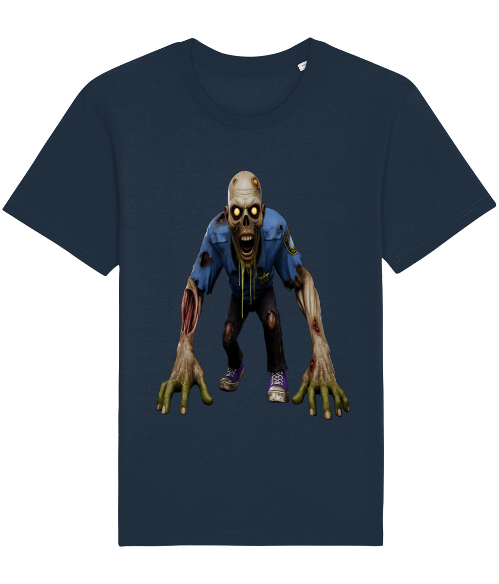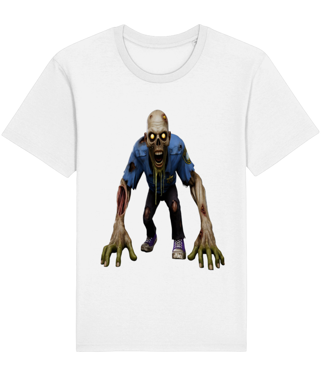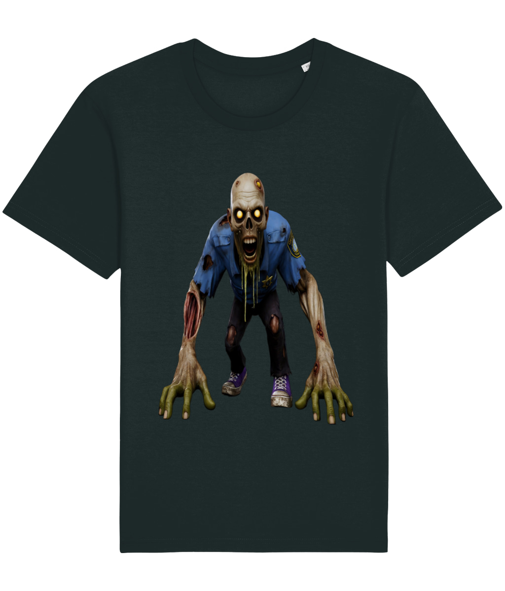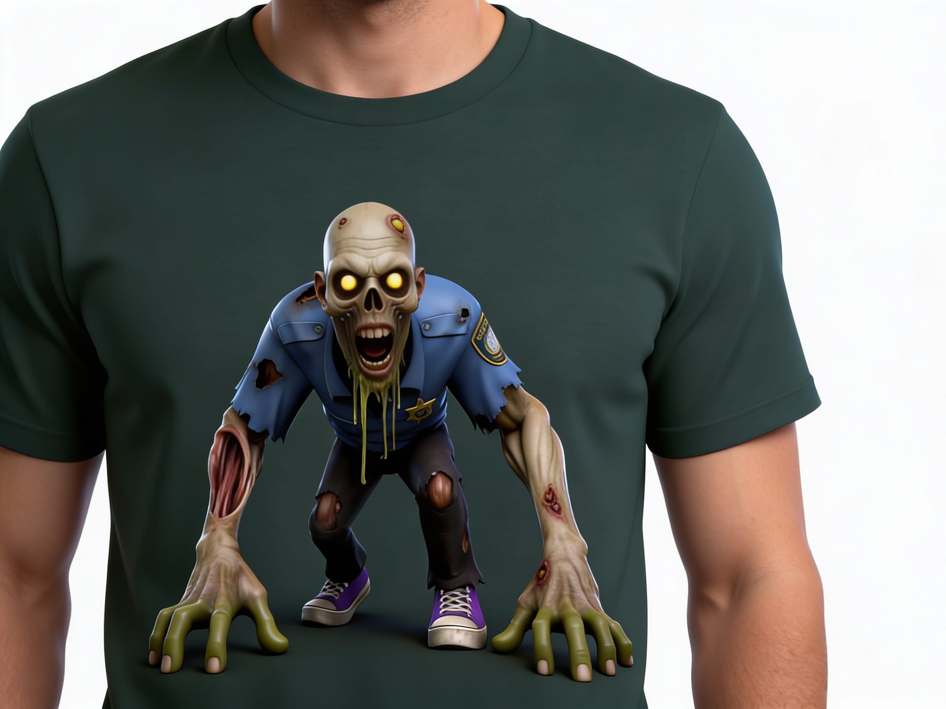 When the apocalypse hits, even law enforcement joins the undead ranks. This striking design features a hyper-detailed 3D-rendered zombie police officer — decayed green skin, glowing yellow eyes, drooling green slime, shredded blue uniform with badge, and menacing crawl pose — ready to enforce some eternal justice.